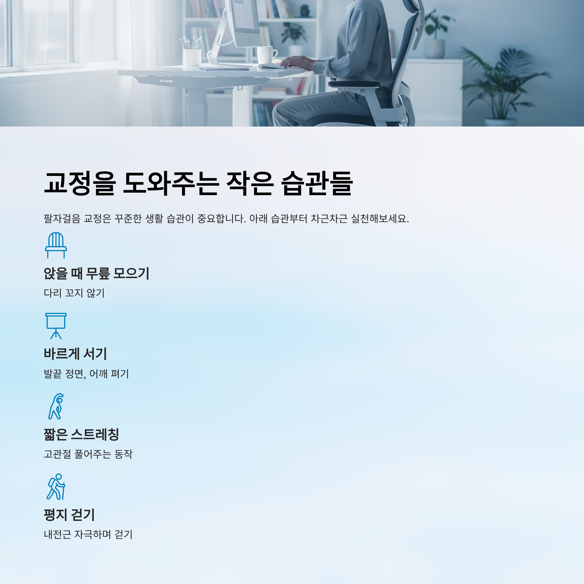 팔자걸음 교정은 꾸준한 생활 습관이 중요한데요, 아래 습관부터 차근차근 실천해보세요.