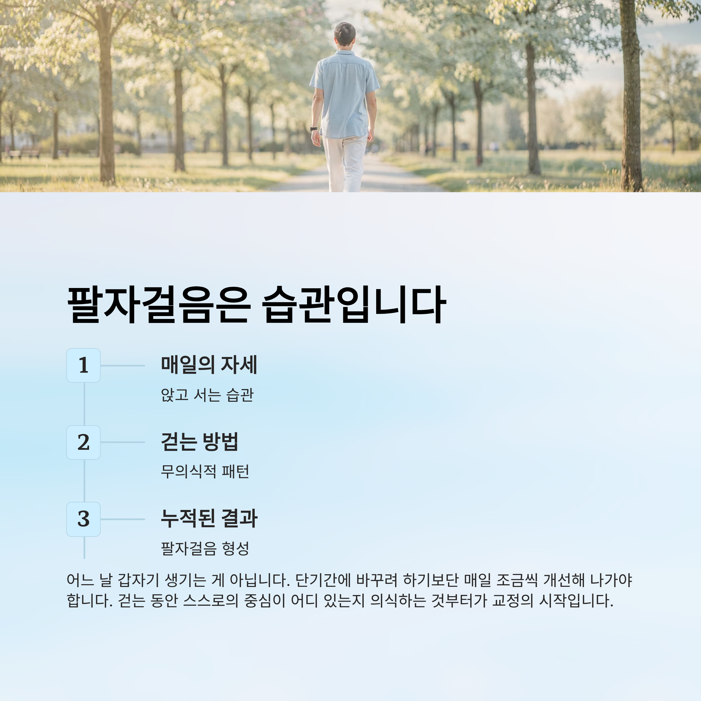 팔자걸음은 보기에는 단순한 걸음걸이 문제처럼 보여도, 몸 전체 균형에 영향을 줄 수 있는 중요한 자세 이슈입니다. 잘못된 걸음걸이가 지속되면 골반, 무릎, 발목뿐 아니라 허리와 목까지 통증을 유발할 수 있습니다. 이 글에서는 팔자걸음이 왜 생기는지, 걷기만 해도 자세가 틀어지는 이유는 뭔지, 그리고 교정을 위한 실질적인 팁까지 함께 알아봅니다.