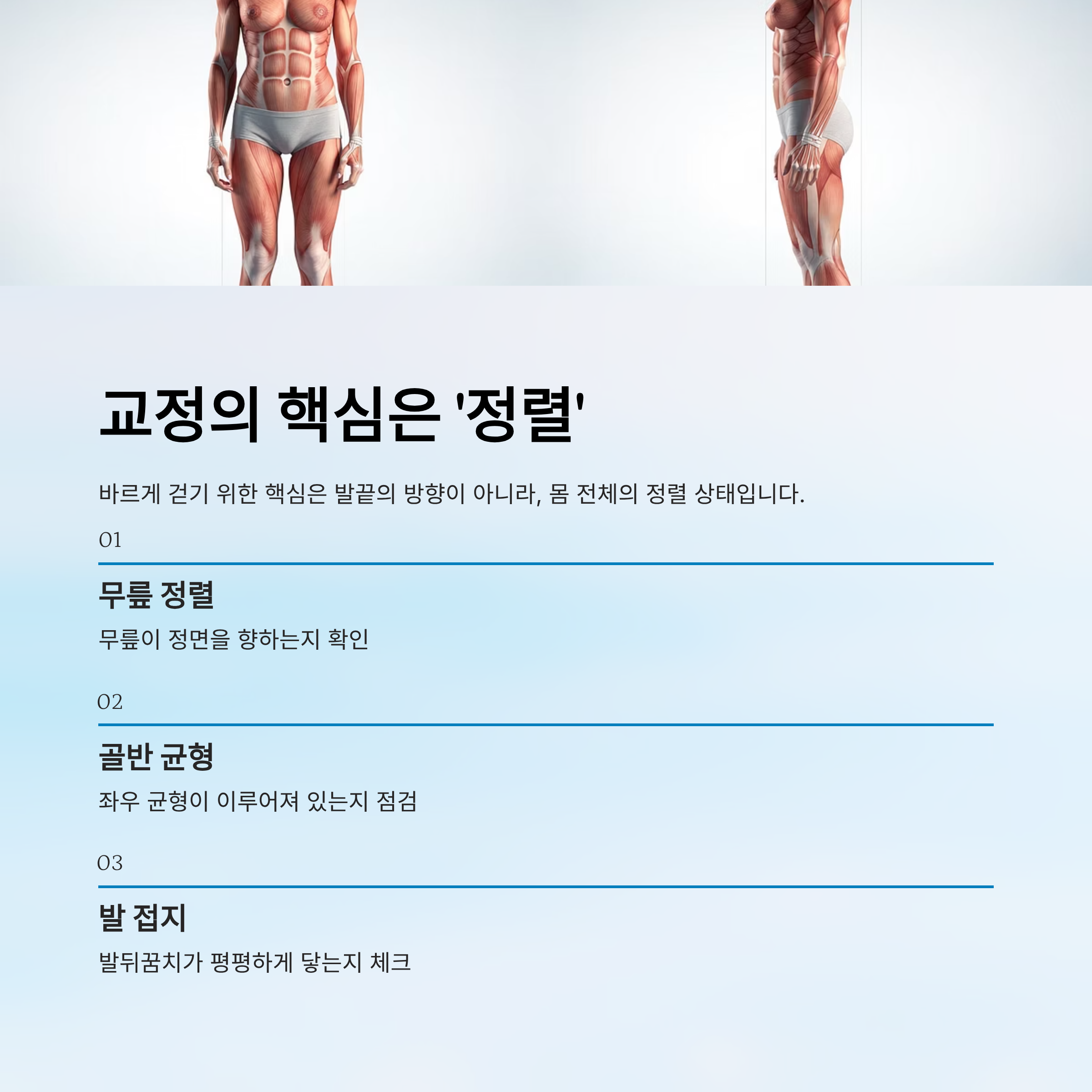 바르게 걷기 위한 핵심은 '발끝의 방향'이 아니라, 몸 전체의 정렬 상태입니다.
