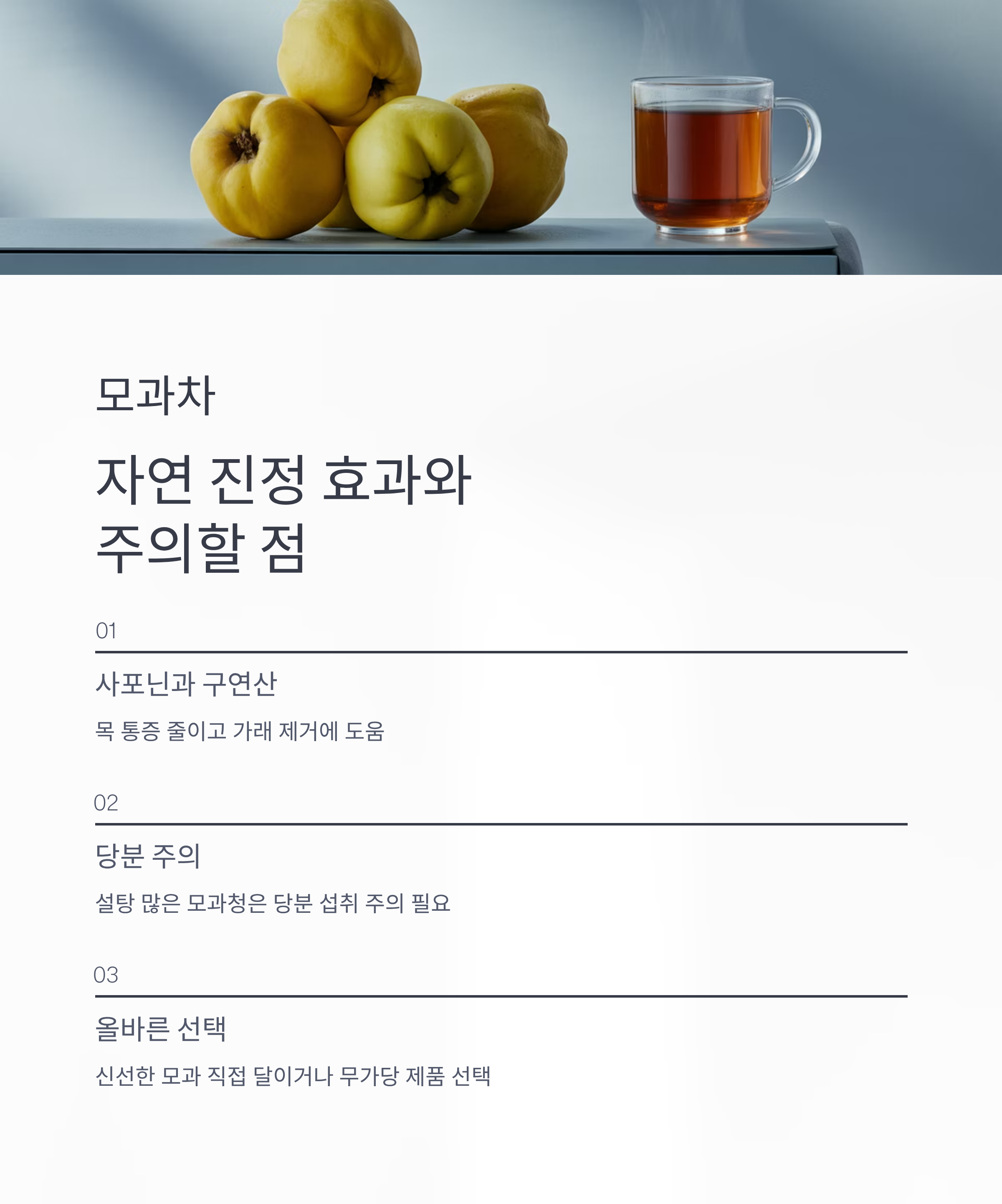 | 모과차 | 사포닌, 구연산 | 진정, 가래 제거 | 당분 주의 필요 |