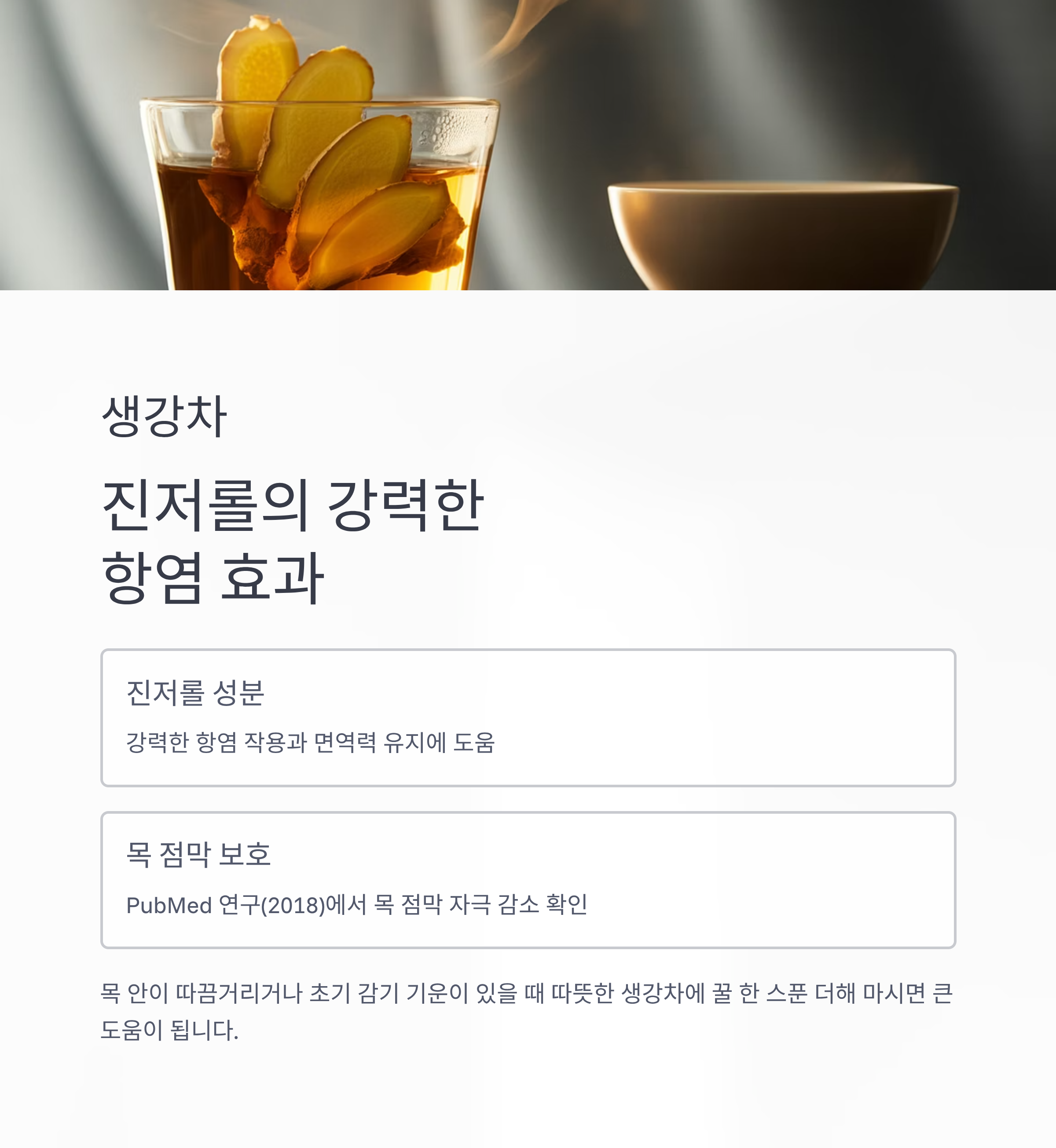 | 생강차 | 진저롤 | 항염, 면역 증진 | 따뜻하게, 꿀과 함께 |