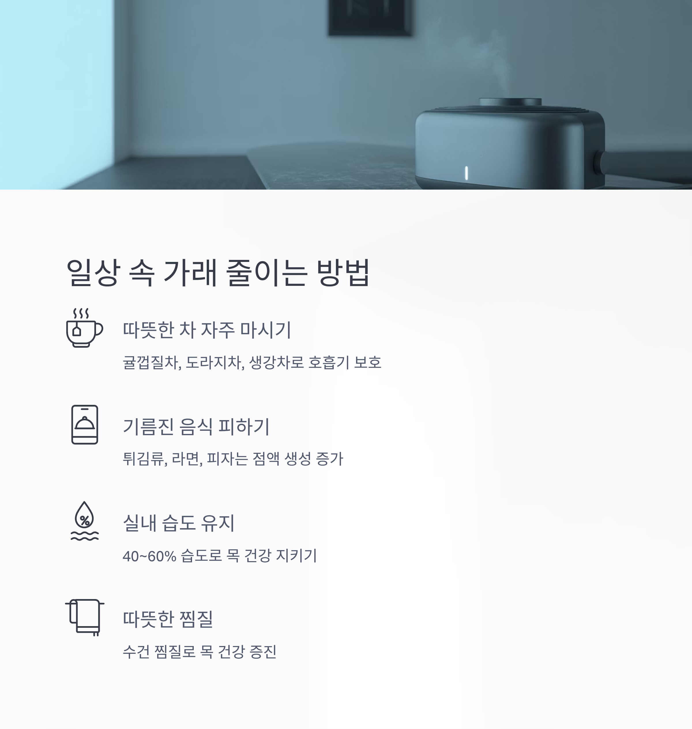 실내 습도를 40~60%로 유지하고, 따뜻한 수건 찜질도 목 건강에 유익하죠.