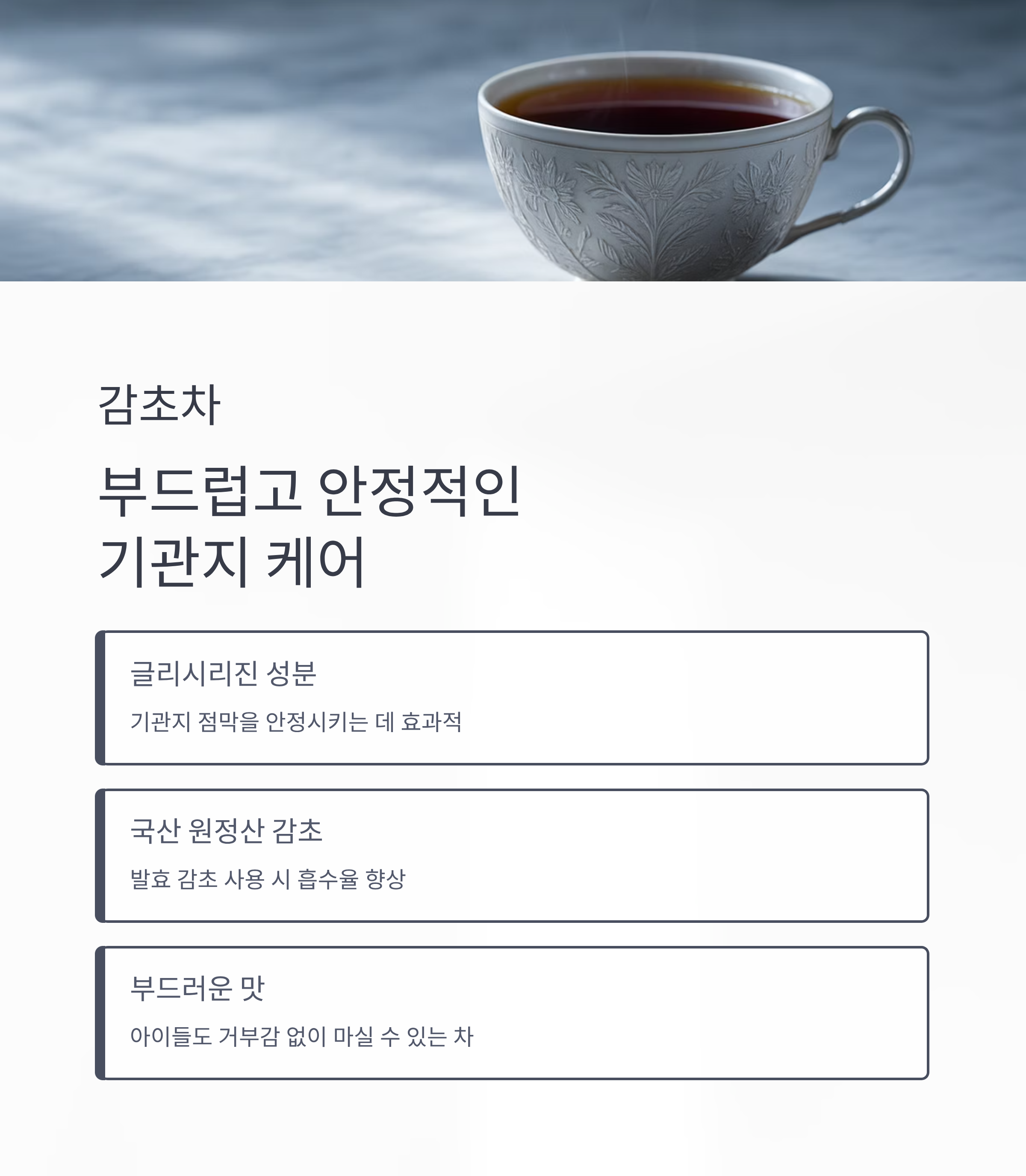감초차에 포함된 글리시리진은 기관지 점막을 안정시키는 데 효과적이라고 알려져 있습니다.