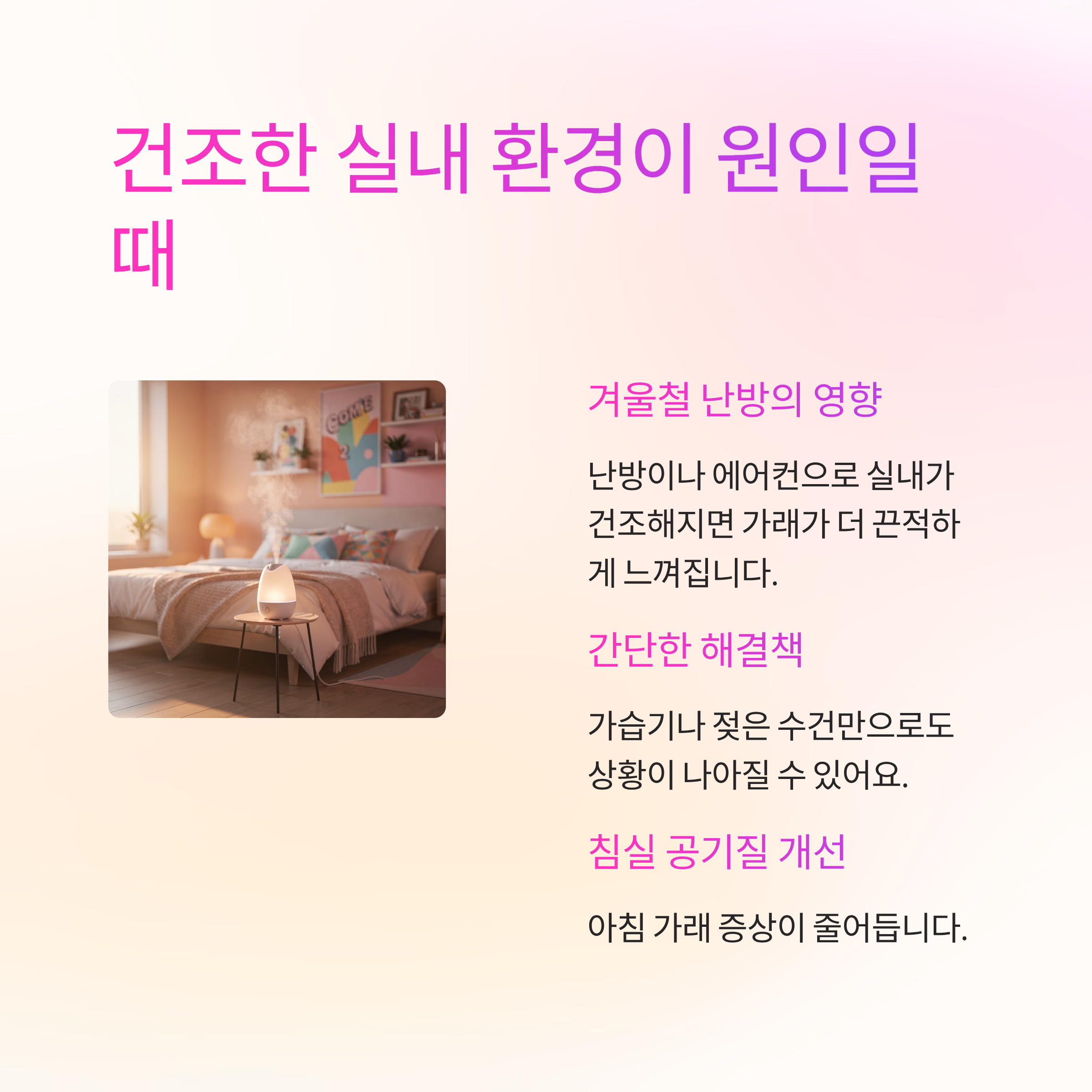 가습기나 젖은 수건 걸기만으로도 상황이 나아질 수 있어요.