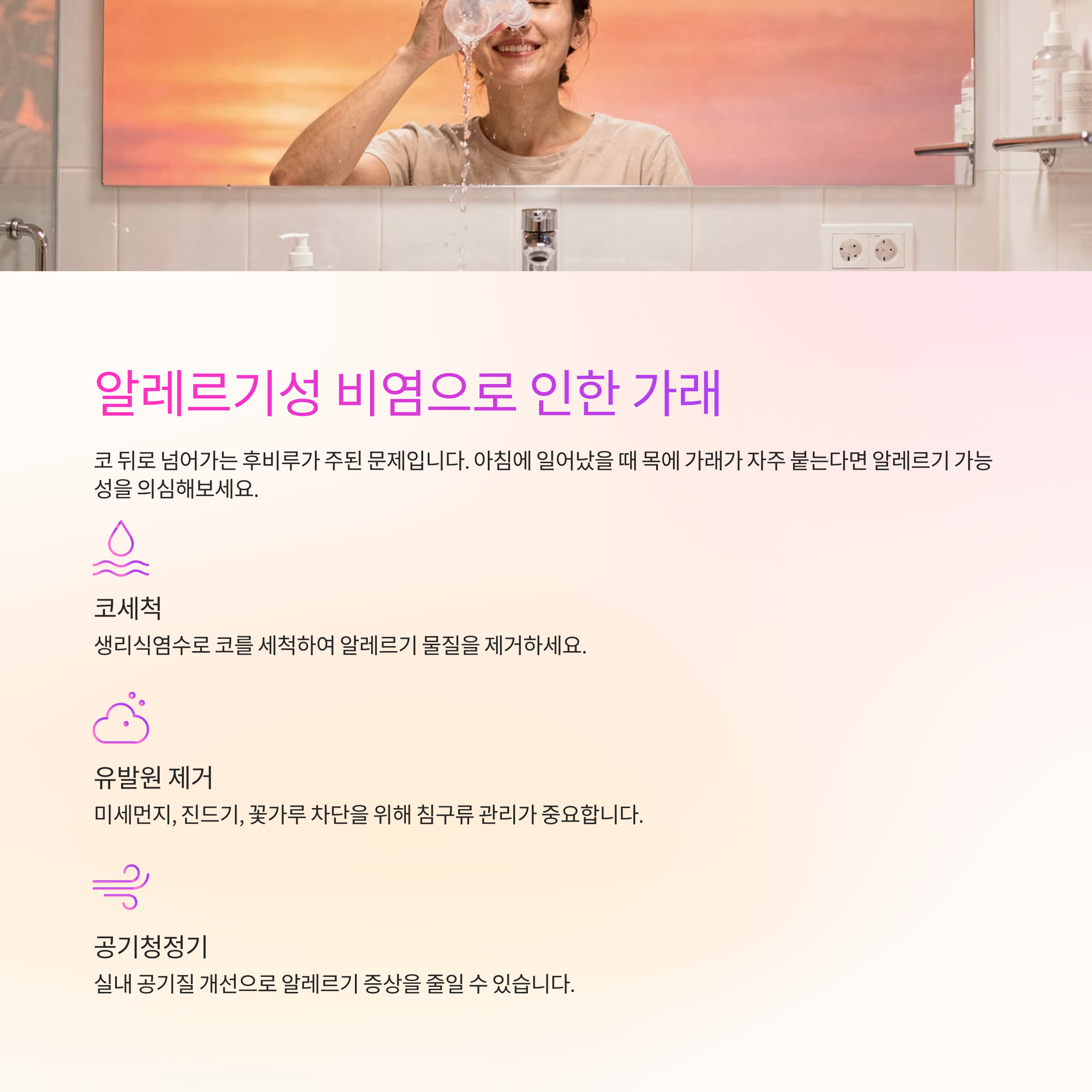 알레르기 비염이 원인일 경우에는 코 뒤로 넘어가는 후비루가 주된 문제입니다. 이때는 코세척과 알레르기 유발원 제거가 핵심이에요.