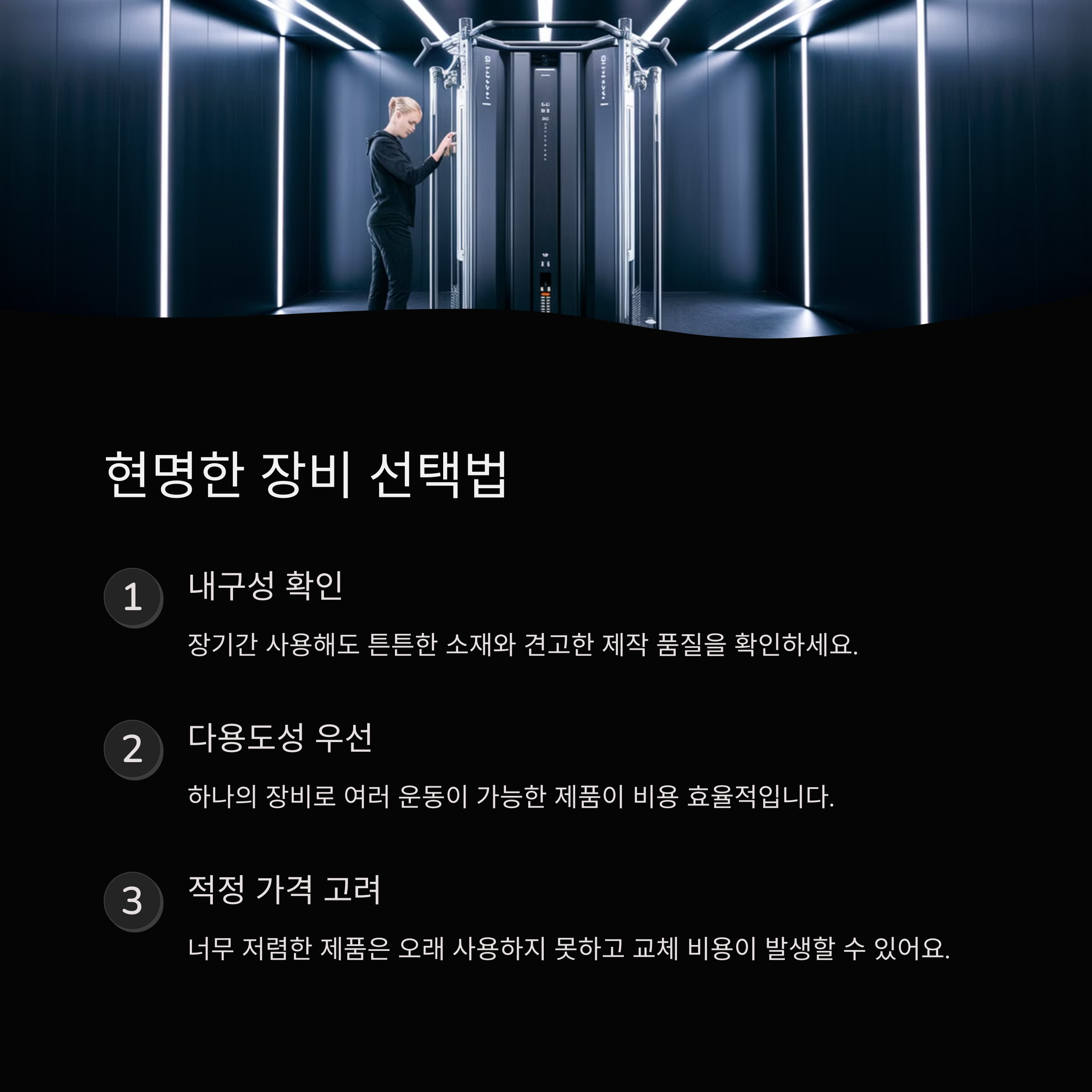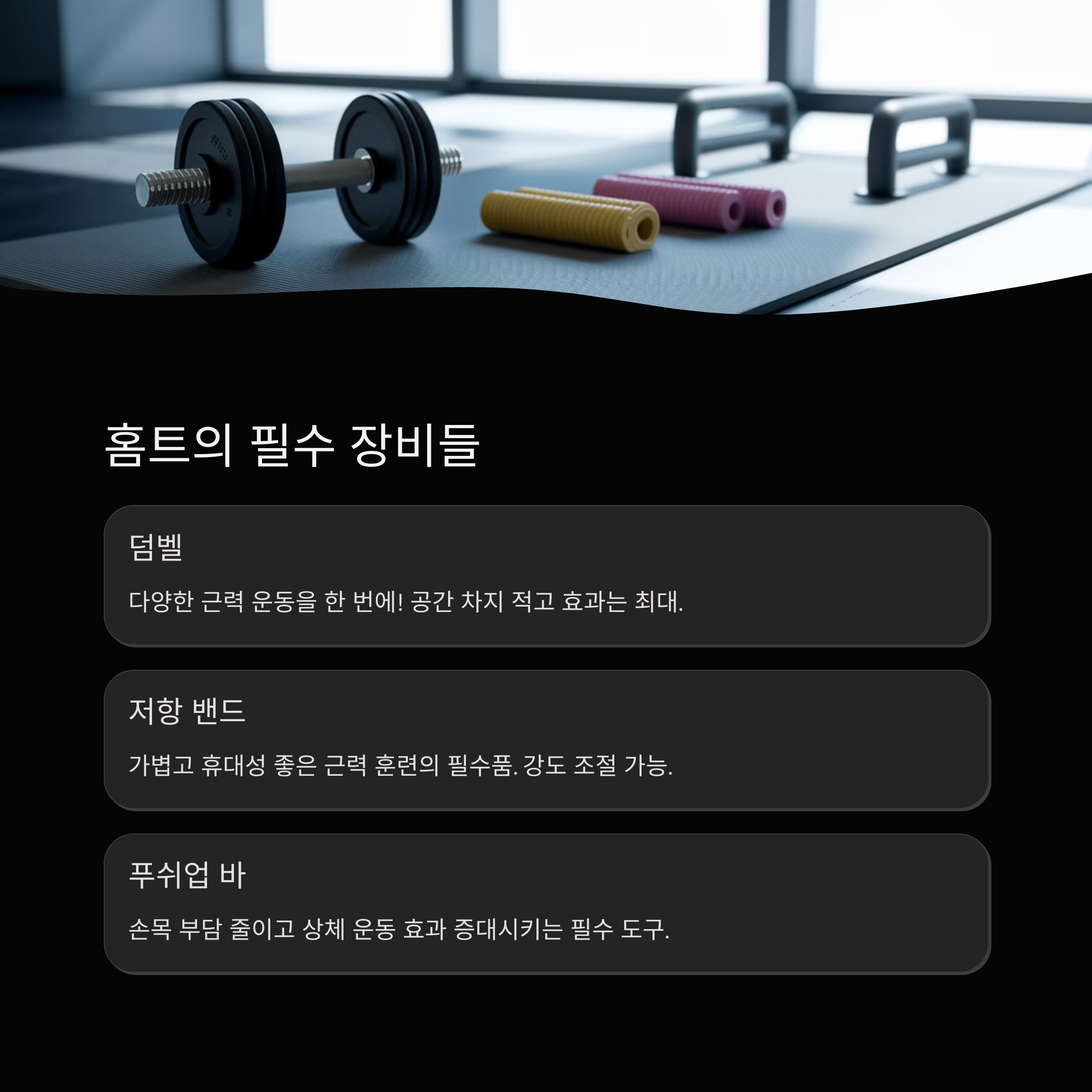 | 홈트 장비 선택 기준 | 내구성, 활용도, 가격 등을 고려해야 합니다. |