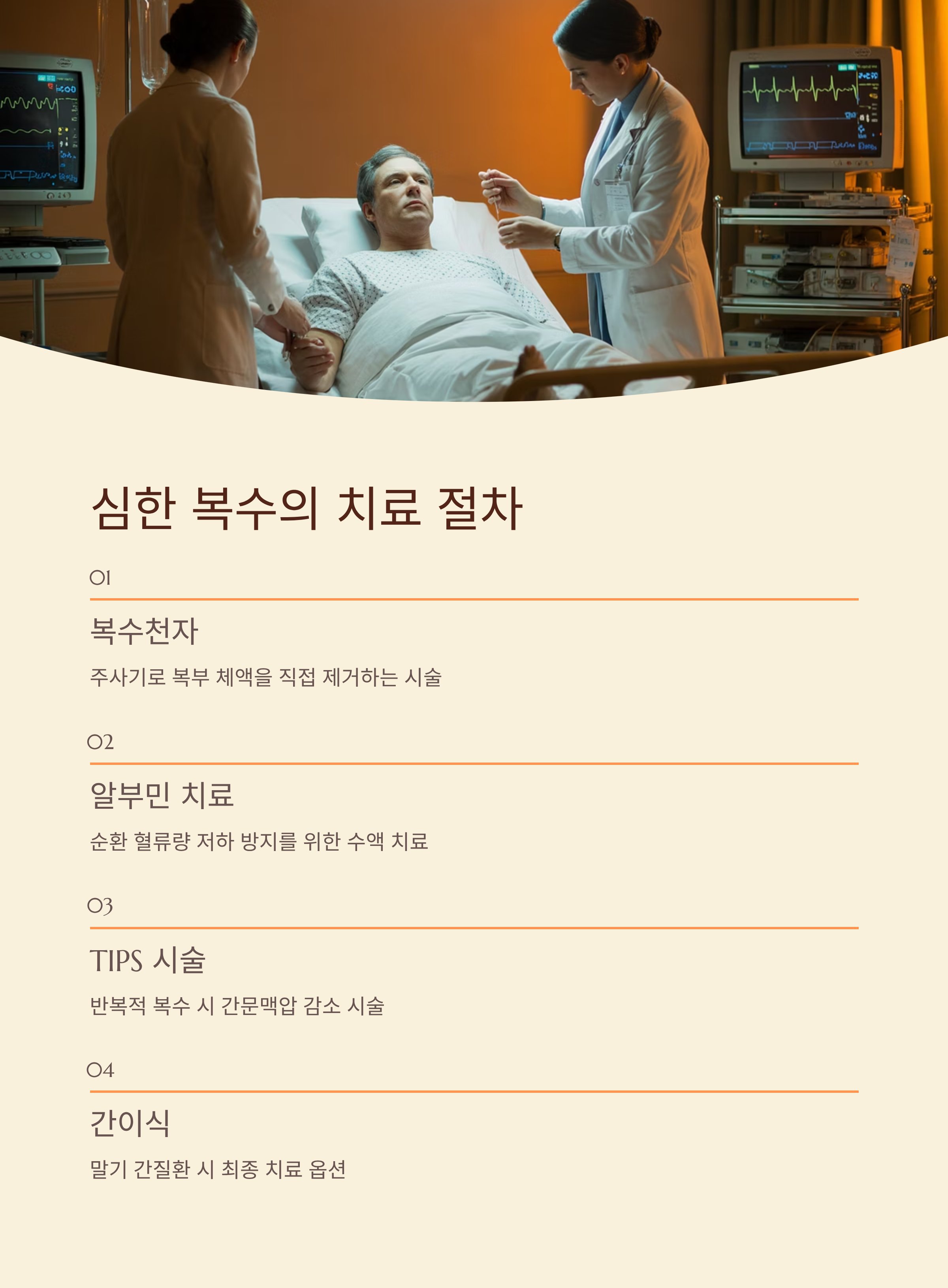 복수천자 후에는 알부민 같은 수액 치료를 병행하여 순환 혈류량 저하를 방지해야 하며, 반복적으로 복수가 차는 경우에는 'TIPS 시술'이나 간이식이 고려될 수 있습니다.