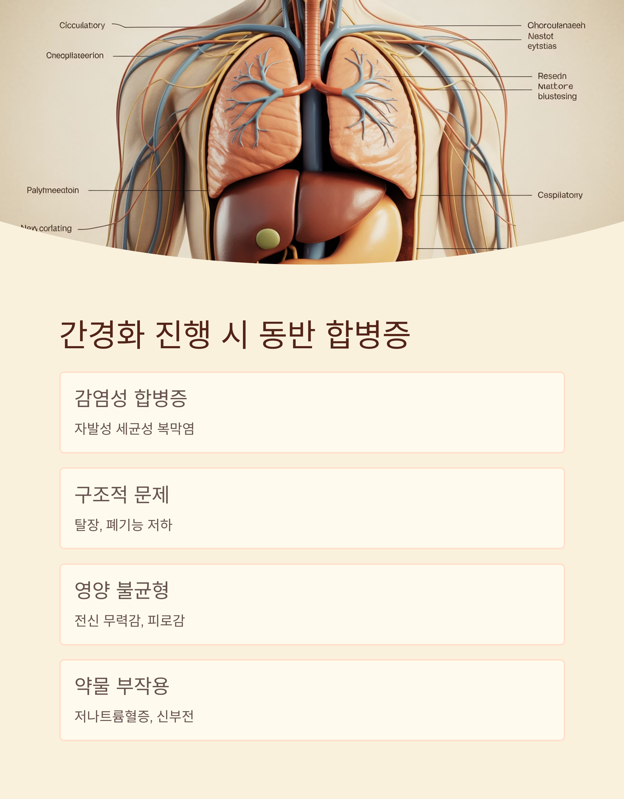 자발성 세균성 복막염, 탈장, 영양 불균형, 폐기능 저하 등은 모두 간기능 저하에 따라 나타날 수 있으며, 과도한 이뇨제 사용은 저나트륨혈증, 고칼륨혈증, 신부전 등을 유발할 수 있습니다.