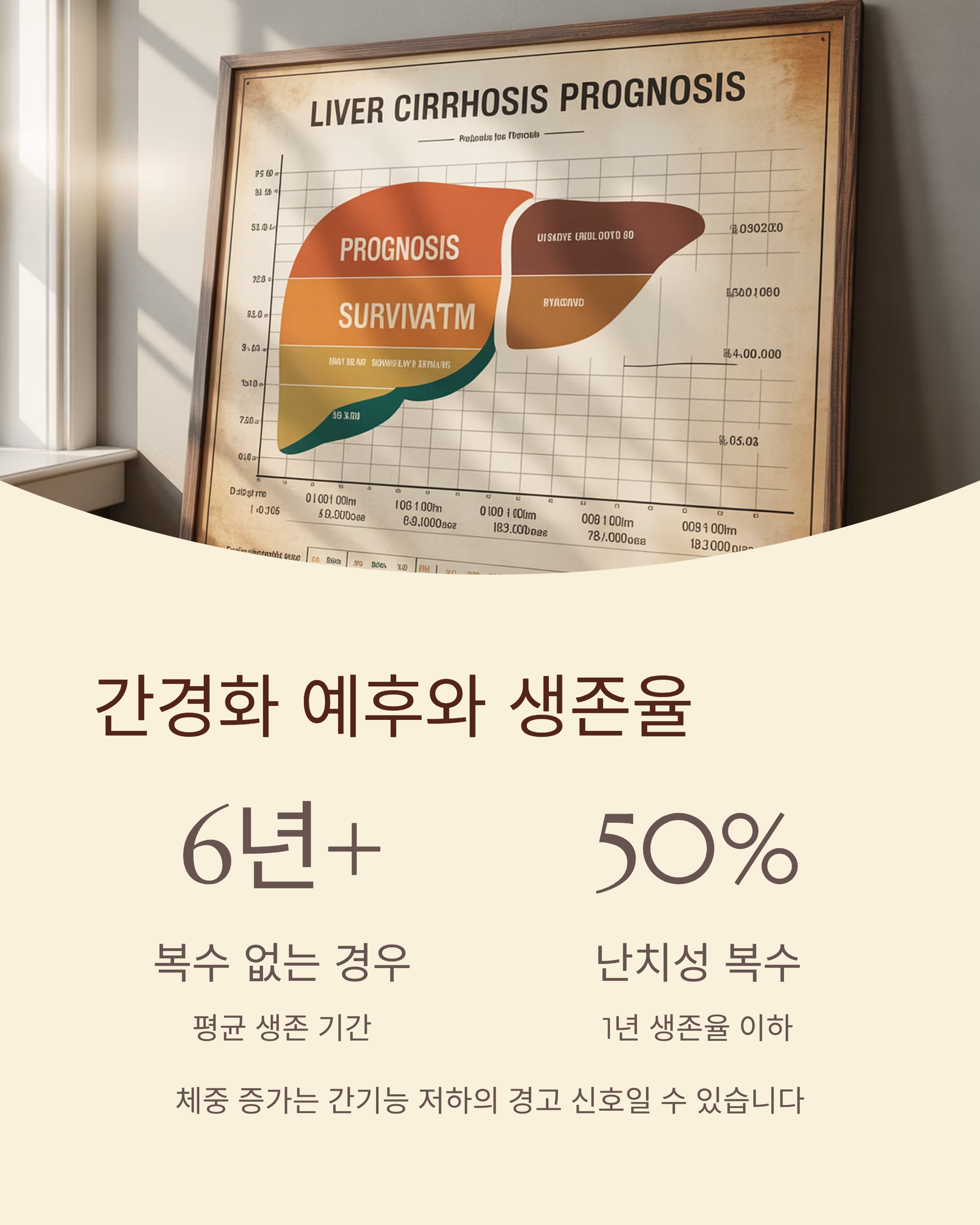 복수가 동반되지 않은 간경화 환자의 평균 생존 기간은 6년 이상인 반면, 복수가 반복되거나 난치성 복수가 생긴 환자의 1년 생존율은 50% 이하로 급감합니다.