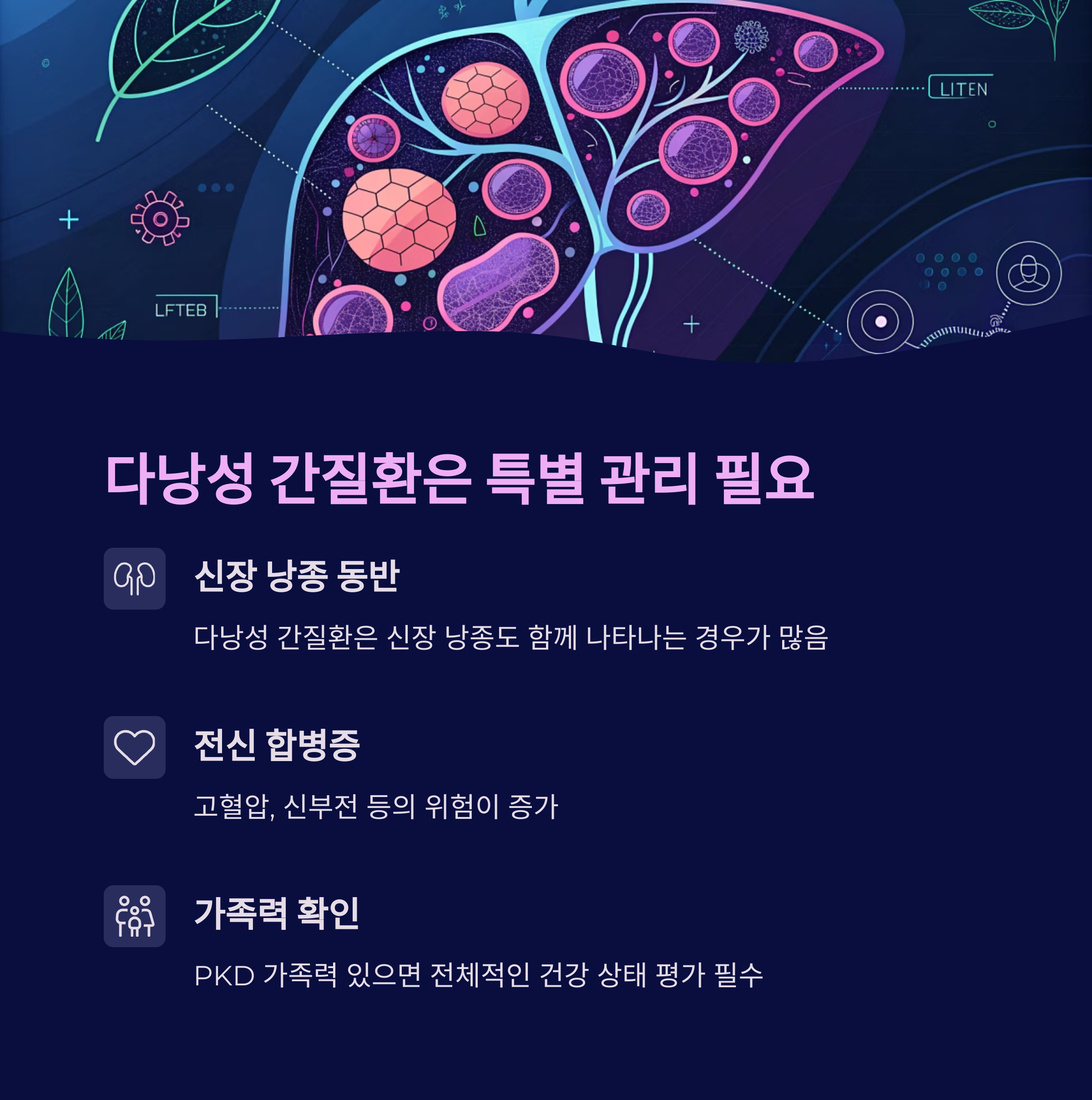다낭성 간질환(PLD)은 수십 개 이상의 낭종이 동반되는 질환입니다.