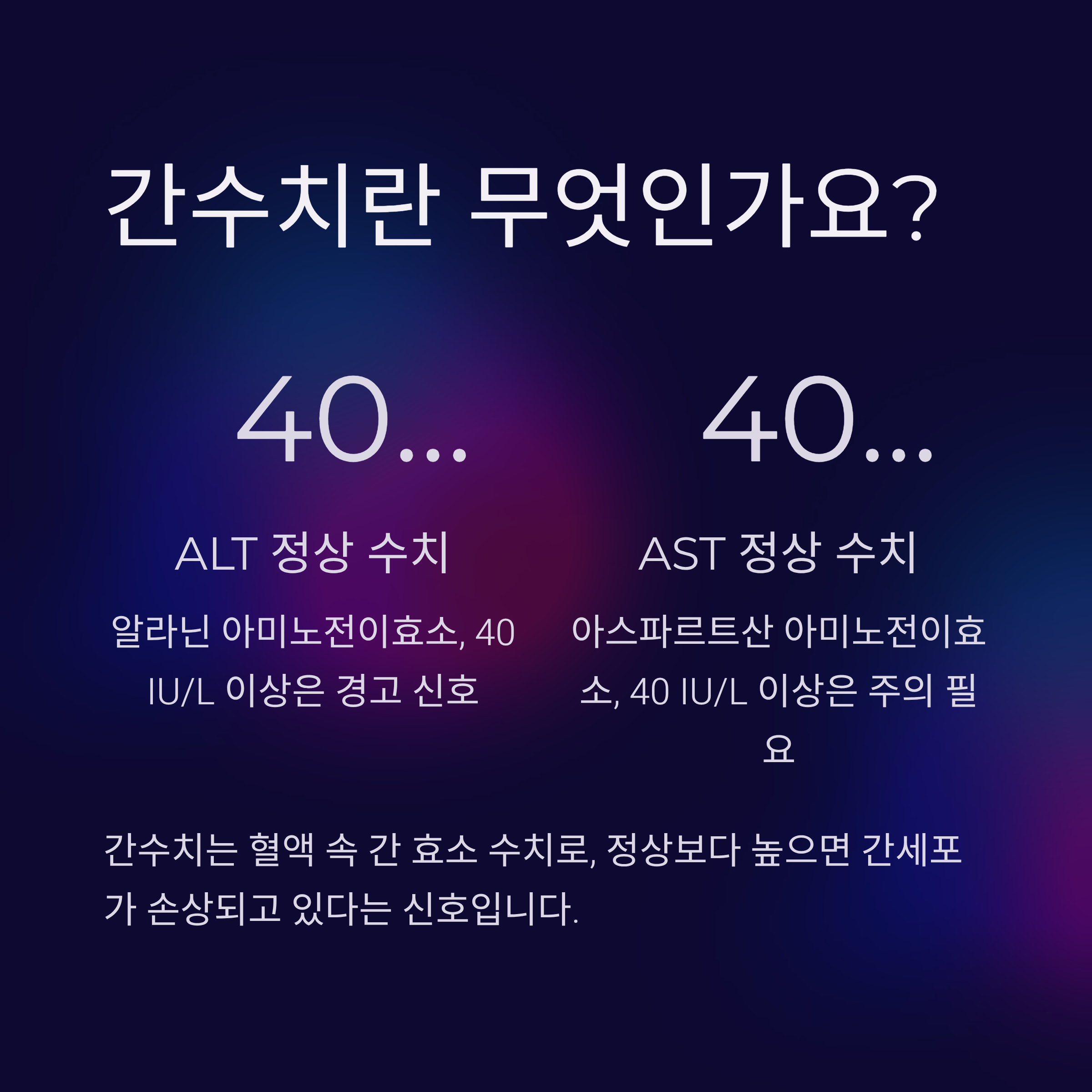 | ALT | 0~40 IU/L | 40 IU/L 이상 |