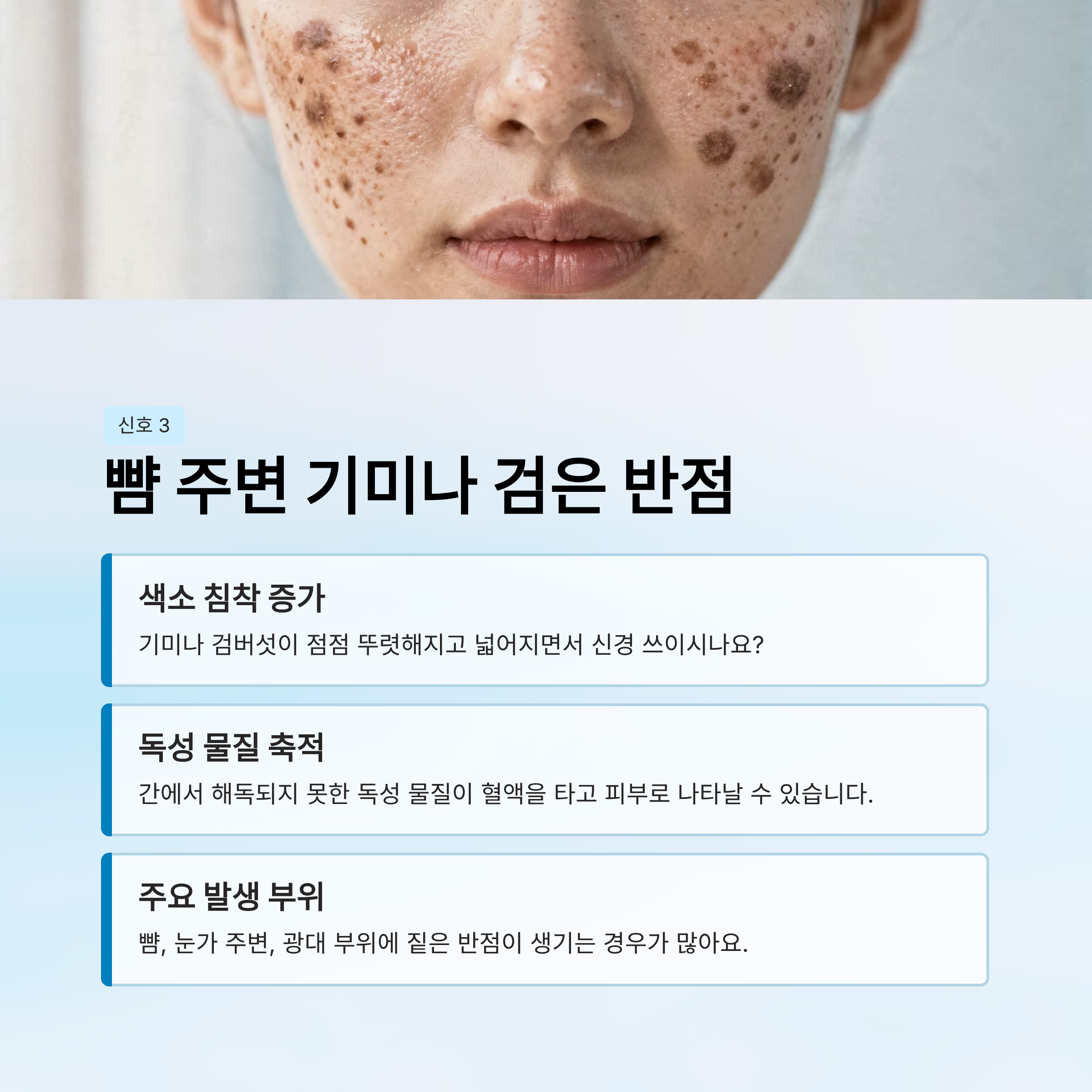 | 뺨 주변 | 기미, 반점 | 색소 침착 늘어날수록 간 피로 가능성 |