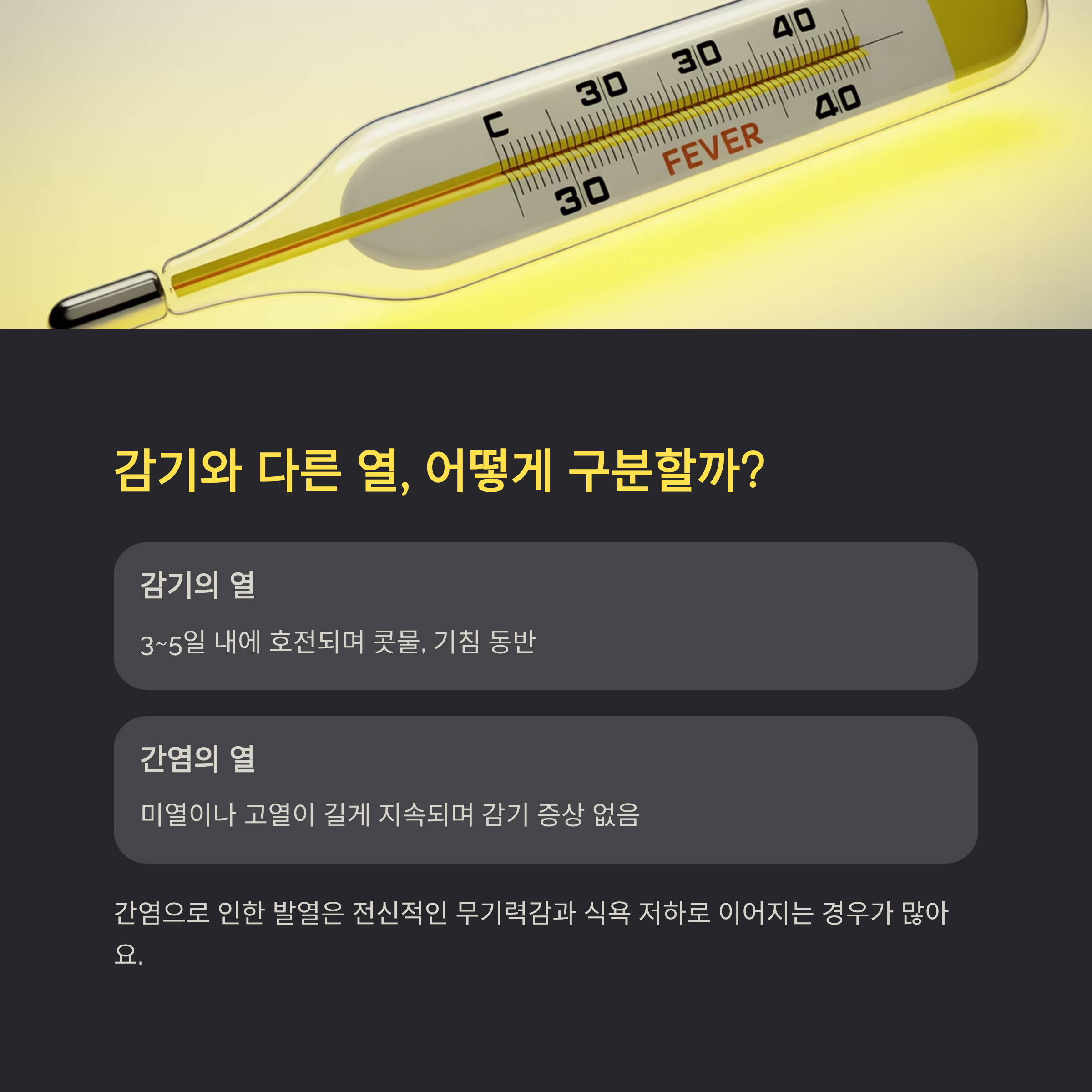 감기의 경우 대부분 3~5일 내에 호전되는 경향이 있습니다. 하지만 간염은 미열이나 고열이 비교적 길게 지속되며, 그 열에 특별한 감기 증상이 동반되지 않는다는 점이 특징입니다.