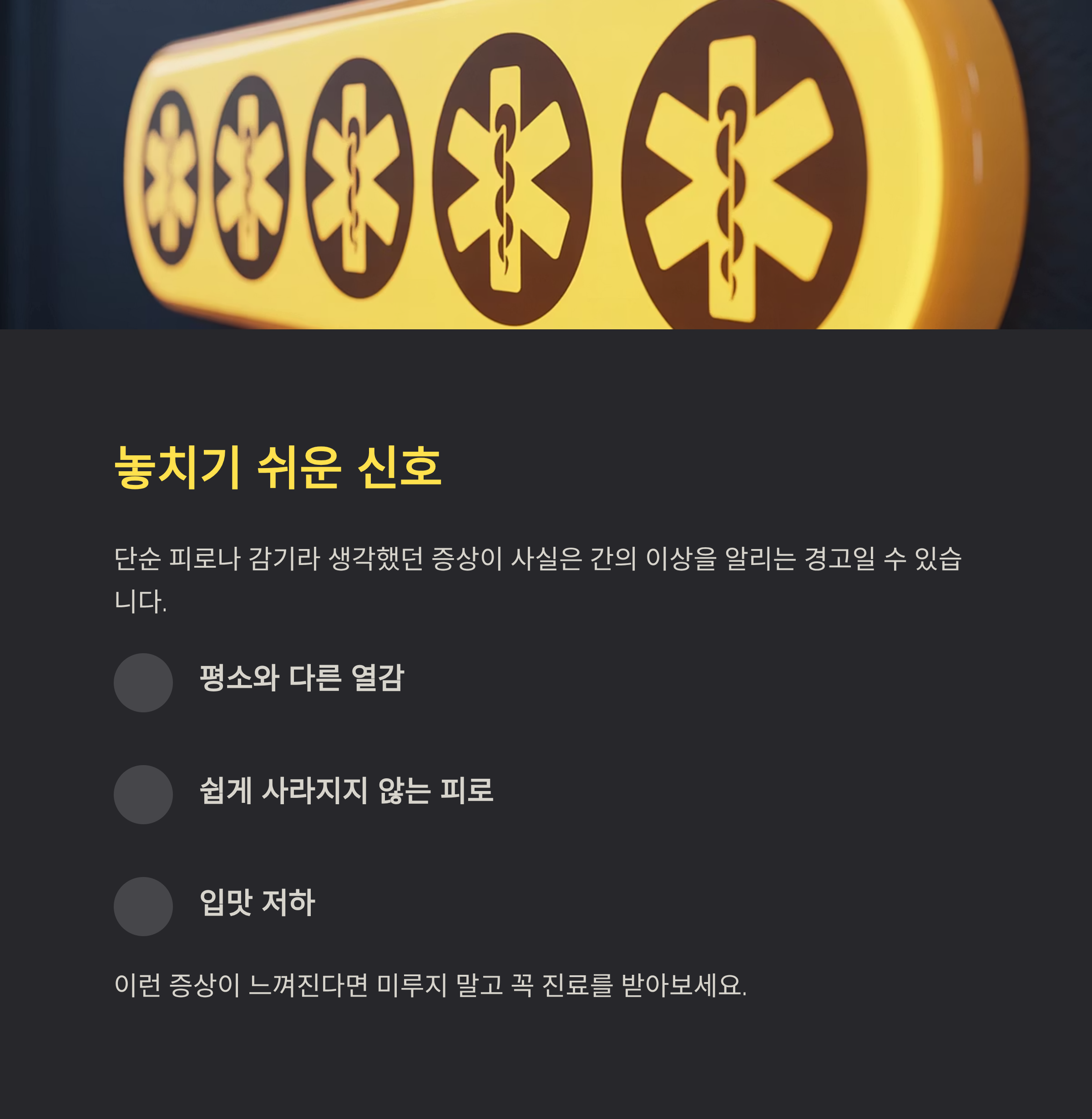 단순 피로나 감기라 생각했던 증상이 사실은 간의 이상을 알리는 경고일 수 있습니다. 평소와 다른 열감, 쉽게 사라지지 않는 피로, 입맛 저하가 느껴진다면 미루지 말고 꼭 진료를 받아보세요.