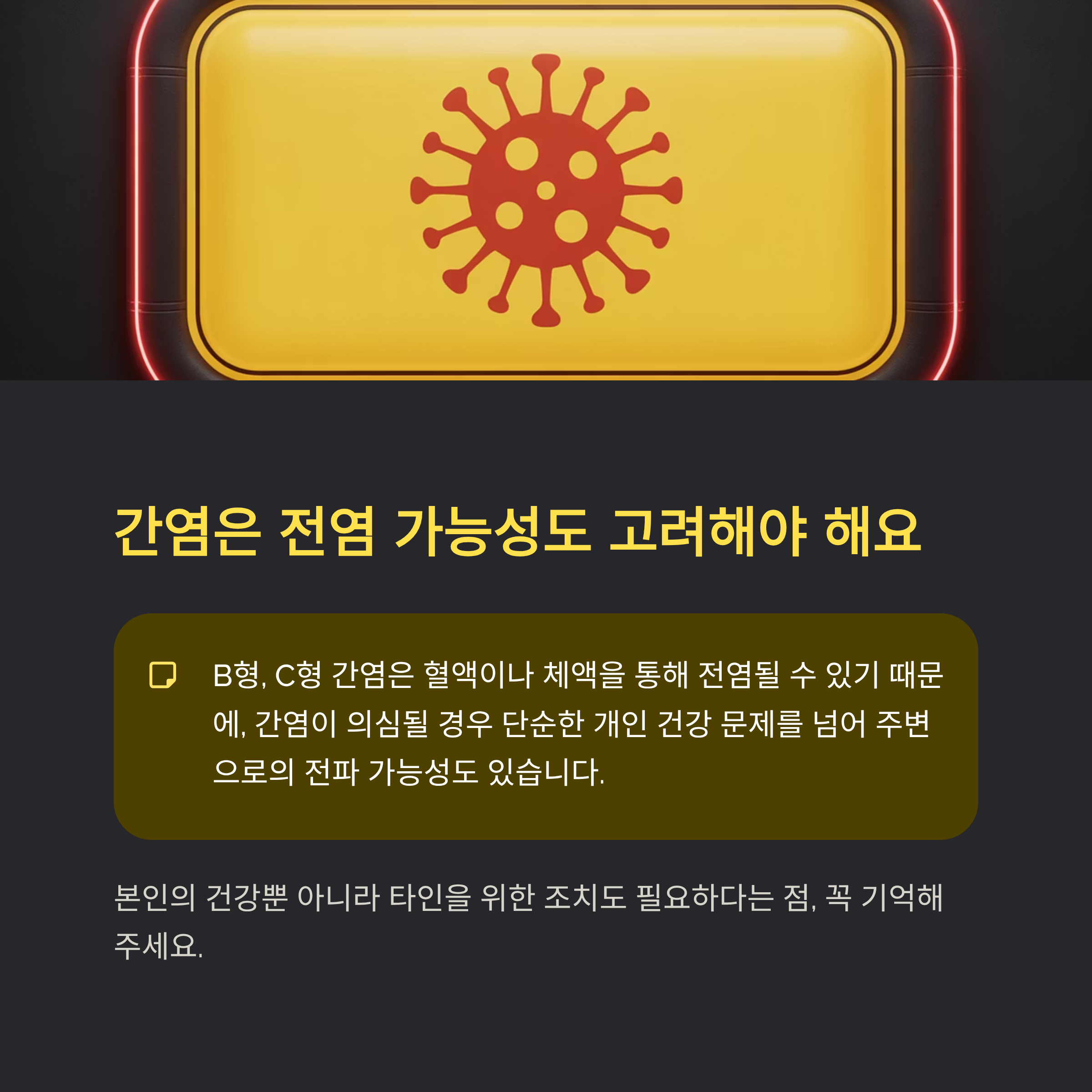 B형, C형 간염은 혈액이나 체액을 통해 전염될 수 있기 때문에, 간염이 의심될 경우 단순한 개인 건강 문제를 넘어 주변으로의 전파 가능성도 있습니다. 본인의 건강뿐 아니라 타인을 위한 조치도 필요하다는 점, 꼭 기억해 주세요.