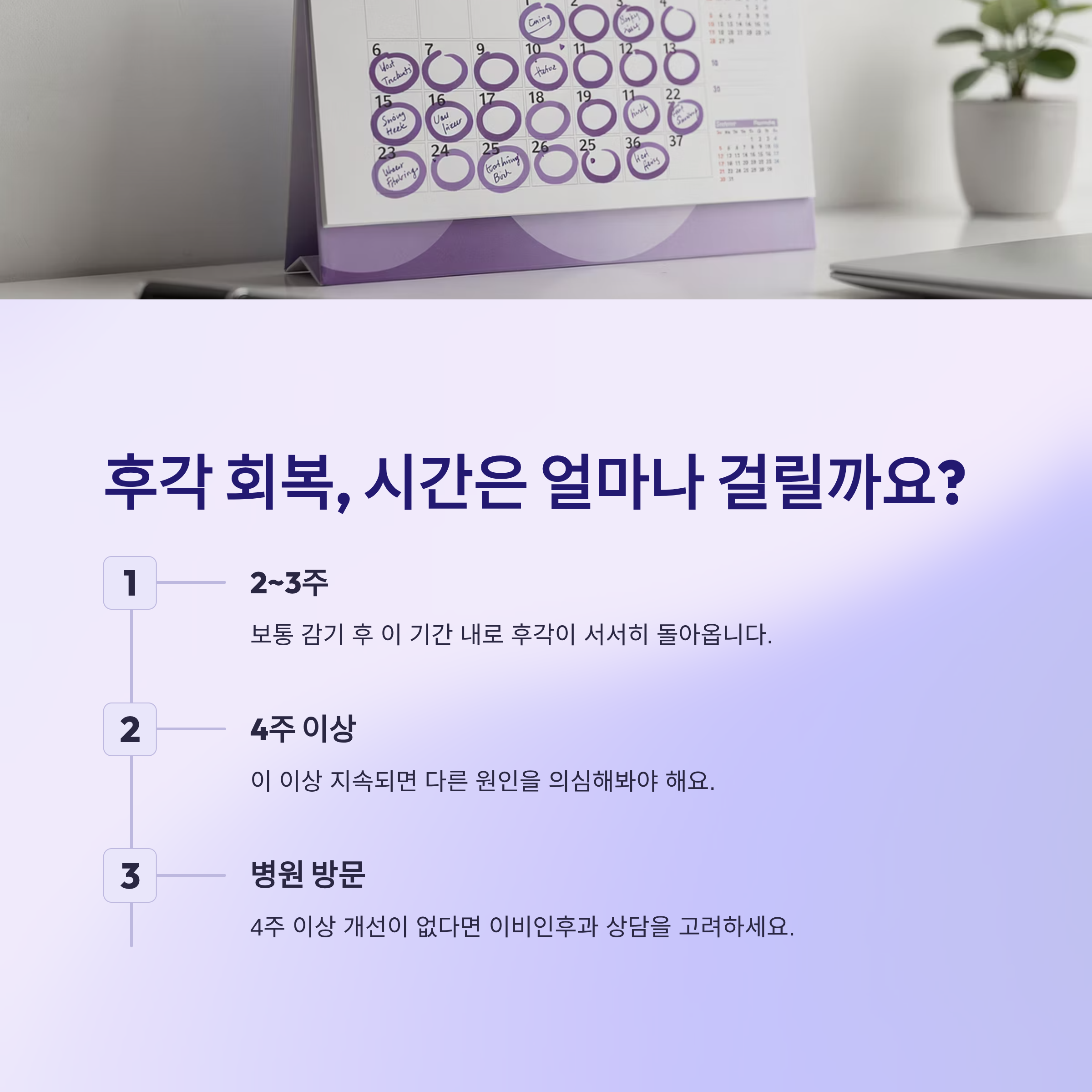 사람마다 다르지만, 보통 감기 후 2~3주 내로 후각이 서서히 돌아오는 경우가 많습니다.