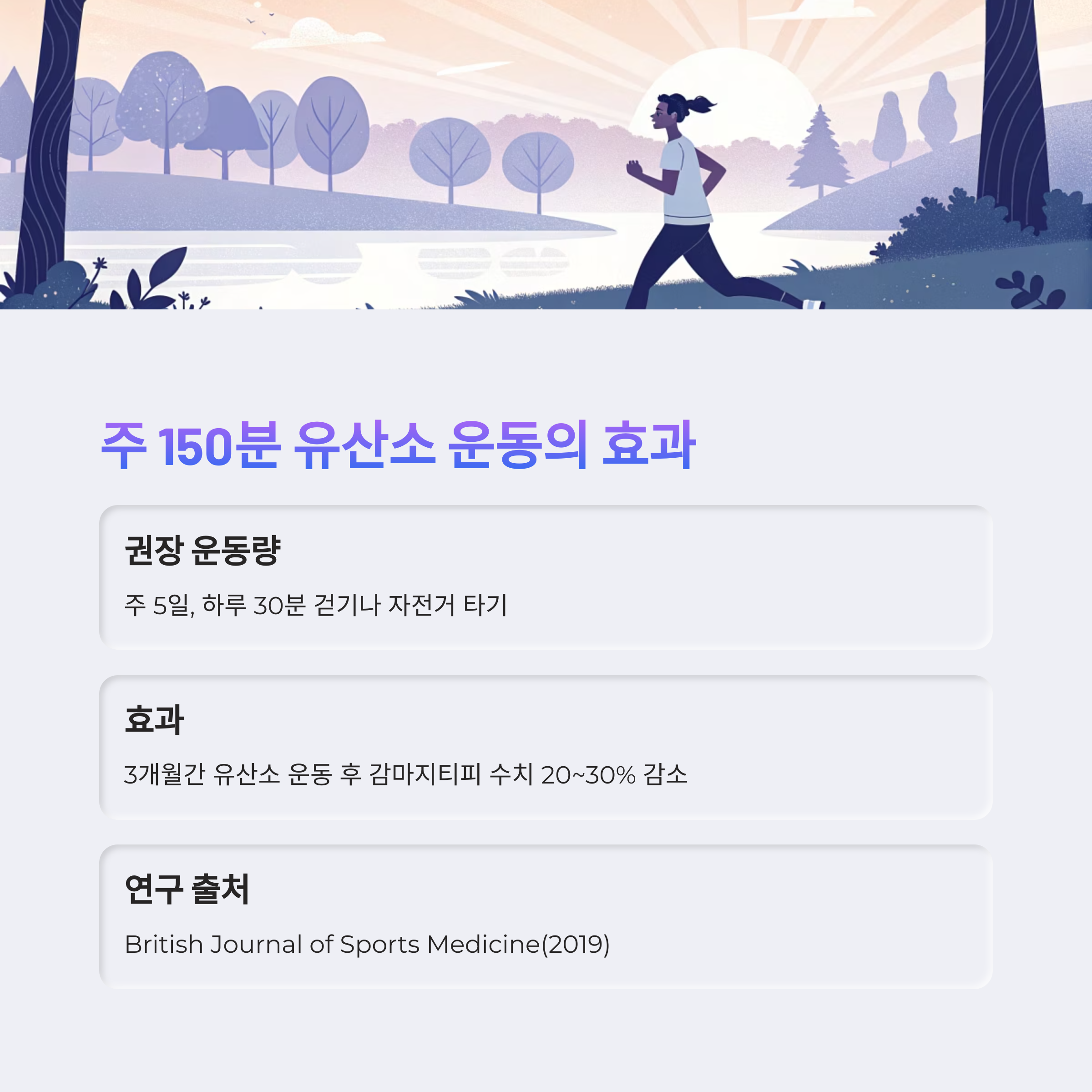 3개월간 유산소 운동 후 감마지티피 수치가 평균 20%에서 30% 감소했습니다.