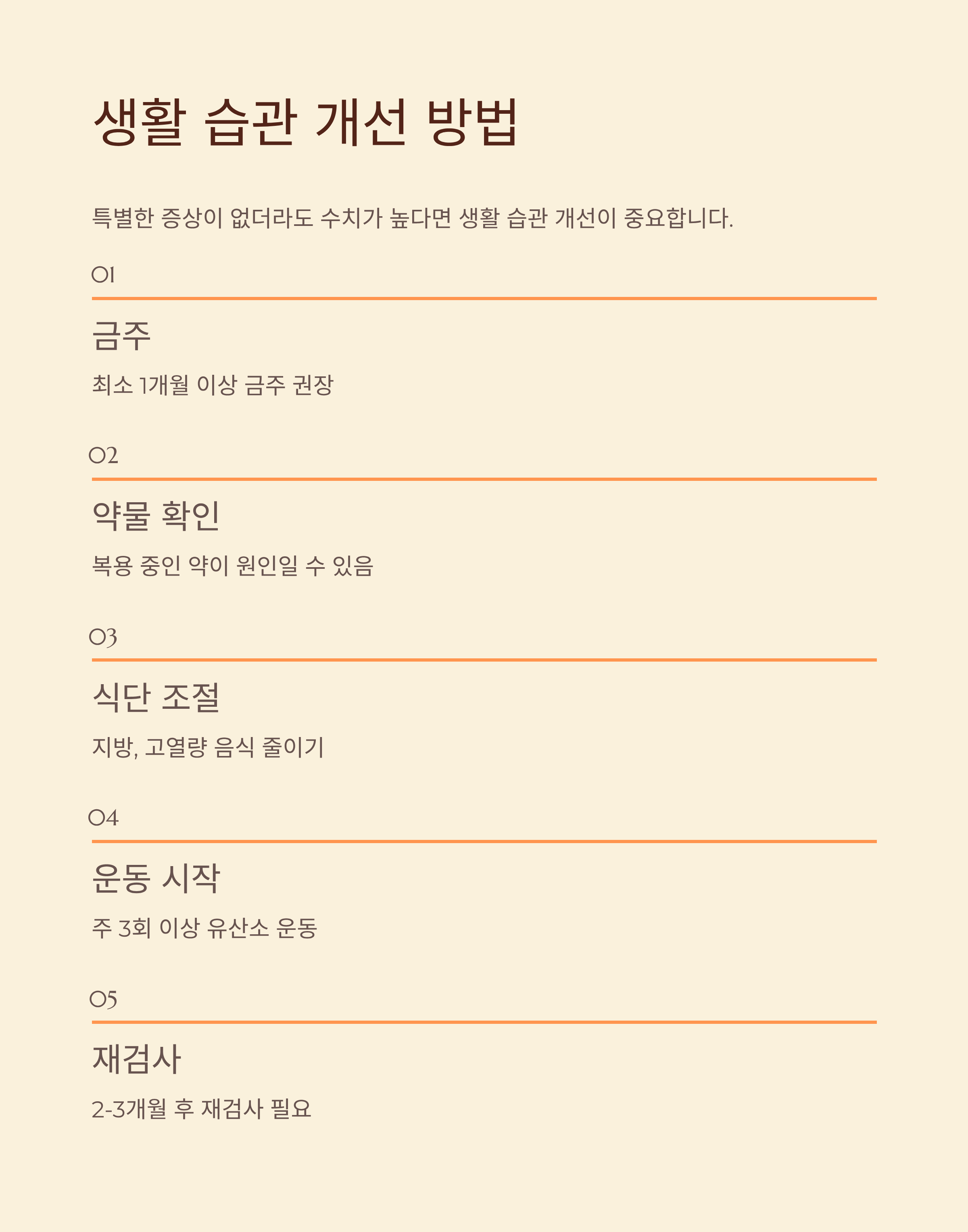 | 조치 방법 | 금주, 식단 개선, 운동, 재검사 |