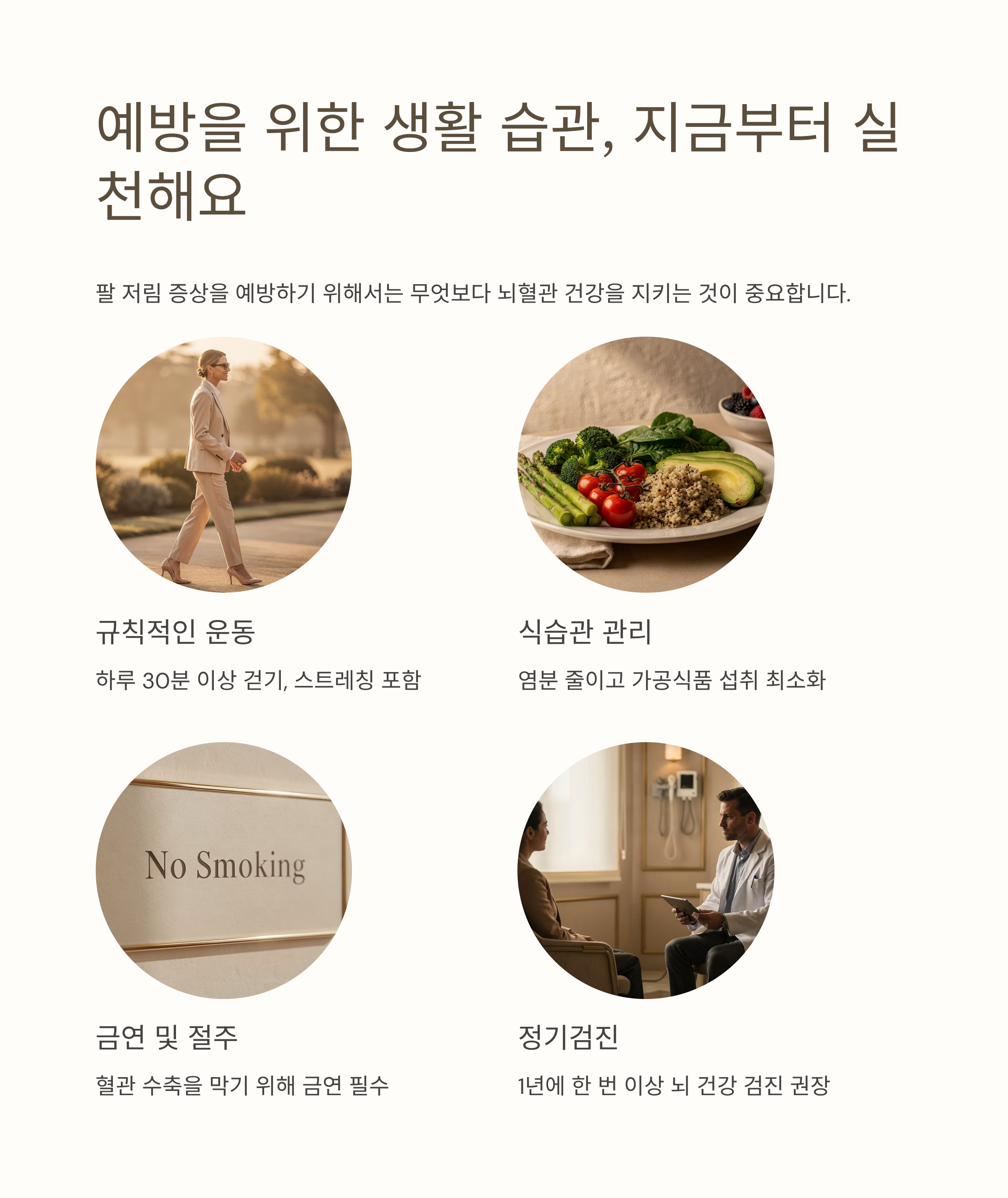 팔 저림과 같은 증상을 예방하기 위해서는 무엇보다 뇌혈관 건강을 지키는 것이 중요합니다.
