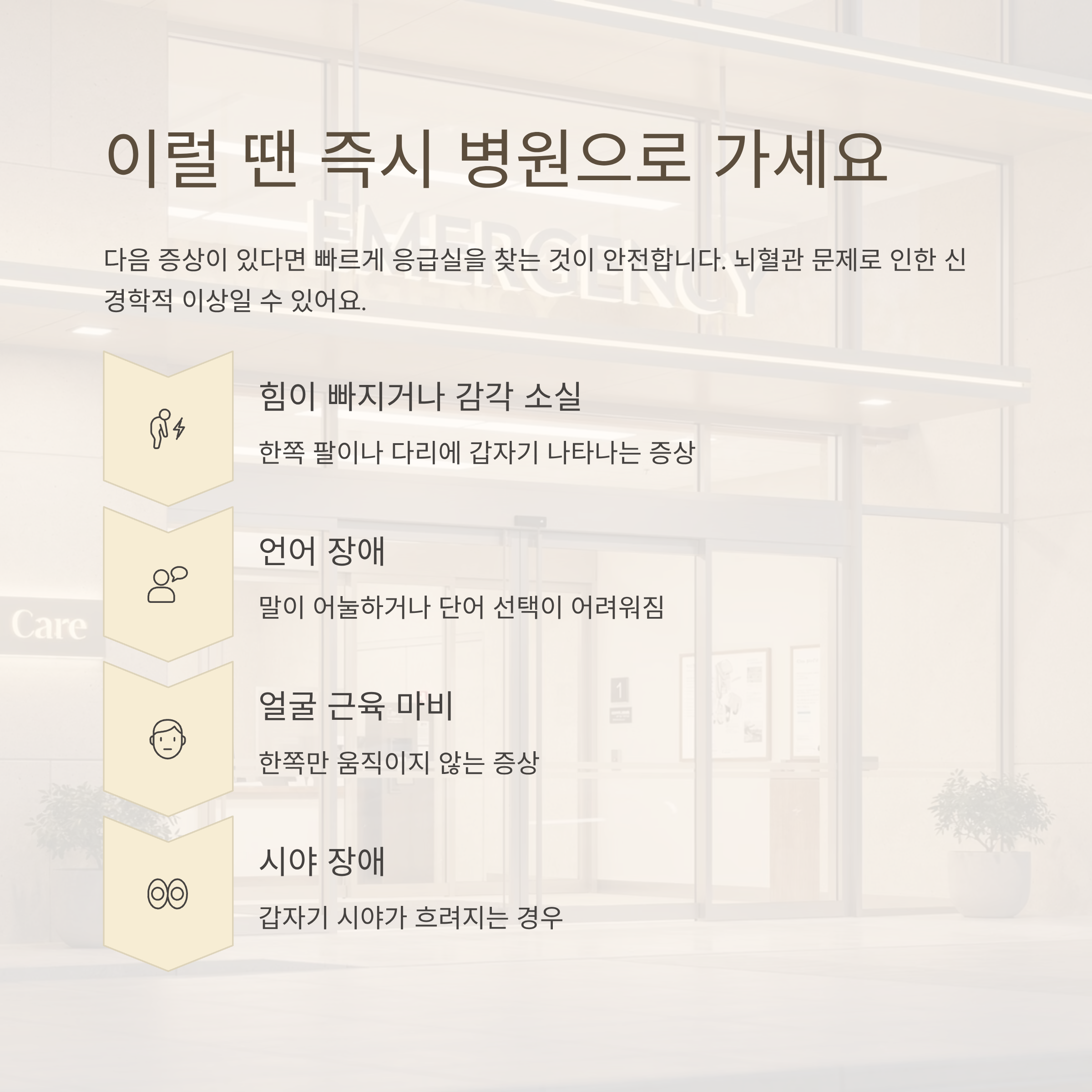 | 일과성허혈발작(TIA) | 일시적 저림, 어지럼증, 시야장애 | 수분~수시간 이내 증상 사라짐 |