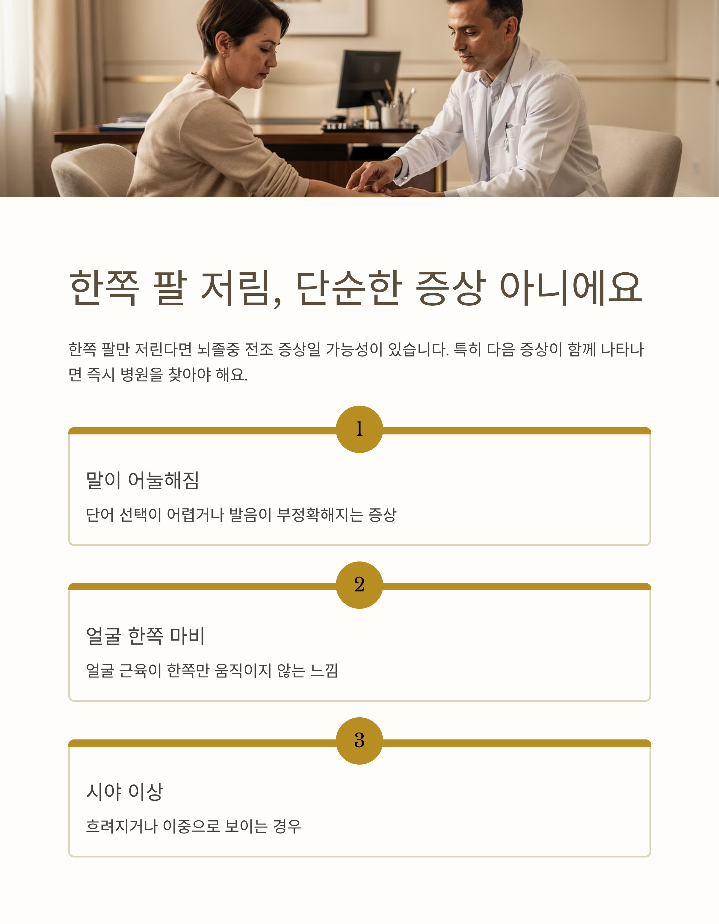 가벼운 팔 저림도 반복되거나 이상한 느낌이 든다면, 반드시 전문가와 상담해야 합니다. 뇌에서 보내는 경고일 수 있다는 사실을 기억하세요. 빠른 대처가 후유증을 줄이는 가장 확실한 방법입니다.