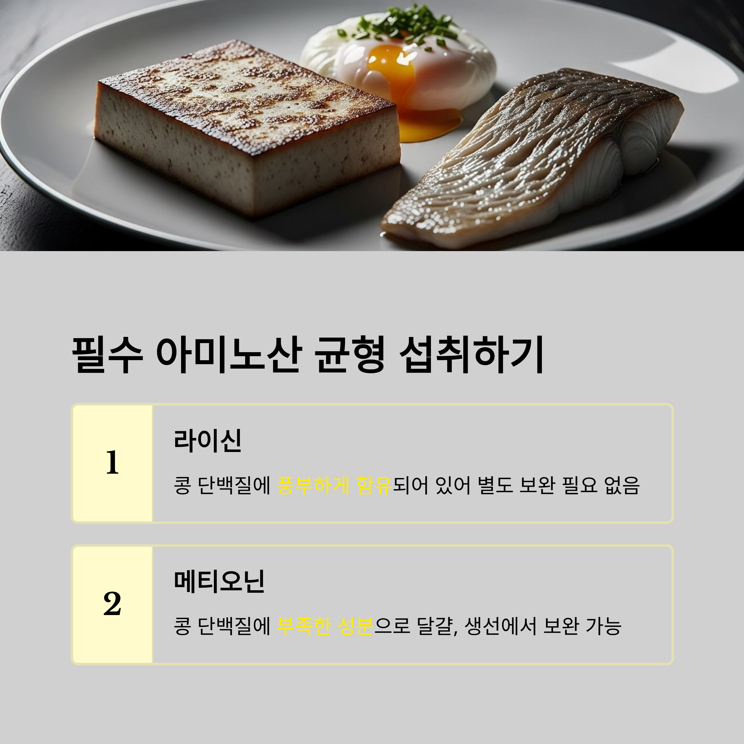 | 메티오닌 | 부족 | 달걀, 생선에서 보완 가능 |