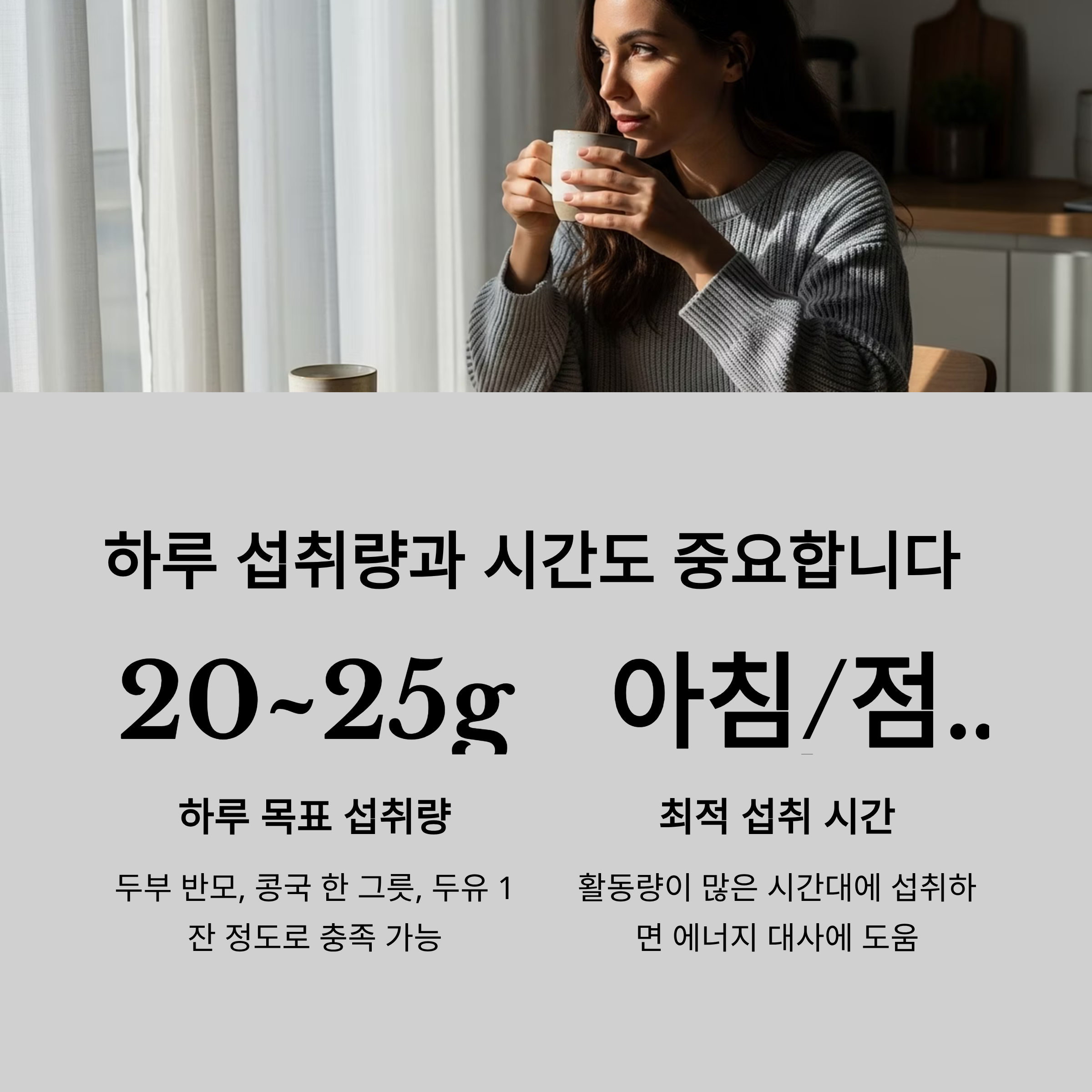 콩 단백질은 하루 20g~25g 정도를 목표로 섭취하는 것이 좋습니다.