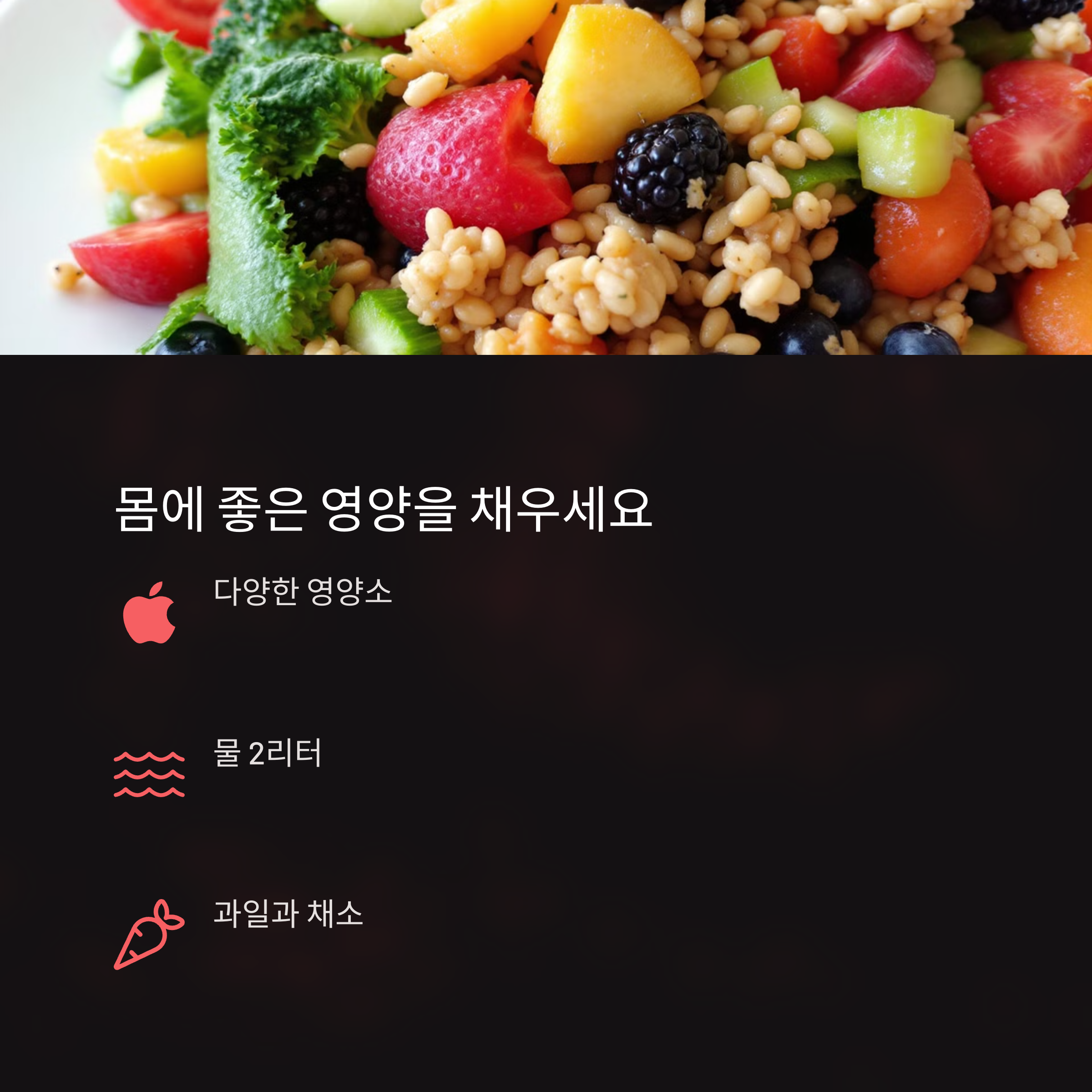 균형 잡힌 식단은 건강을 유지하는 데 필수적입니다. 과일과 채소, 단백질, 건강한 지방을 적절히 섭취하는 것이 중요해요. 다양한 영양소를 섭취하는 것이 우리 몸의 에너지 수준을 높이고, 면역력도 향상시킵니다. 하루 3끼를 규칙적으로 먹고, 가공된 음식은 줄이는 것이 건강을 지키는 첫걸음입니다.