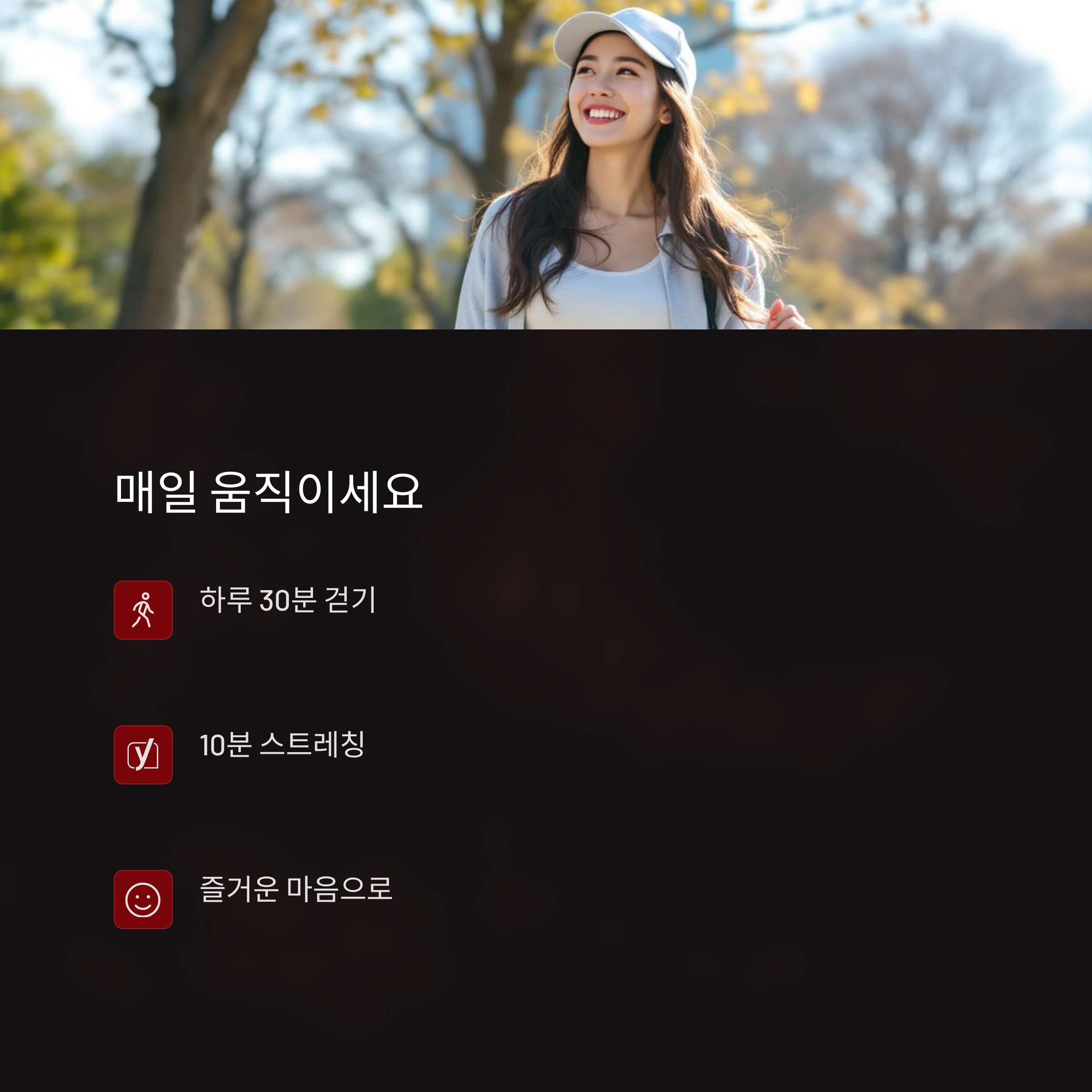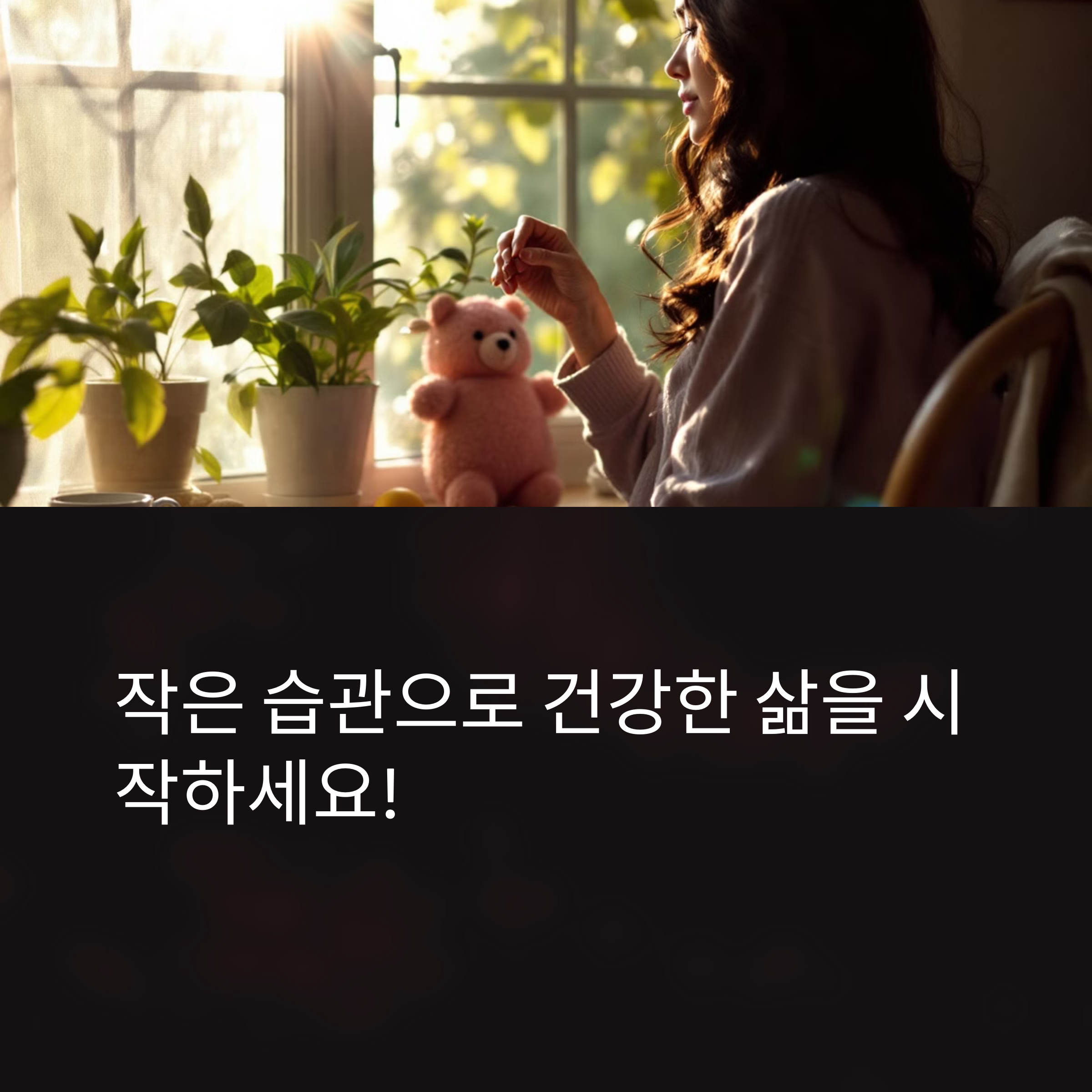 건강한 라이프스타일은 한 번에 완성되지 않지만, 매일 실천을 통해 점차적으로 나아질 수 있습니다. 여러분도 할 수 있습니다! 꾸준히 실천하면서 여러분의 변화를 응원합니다.