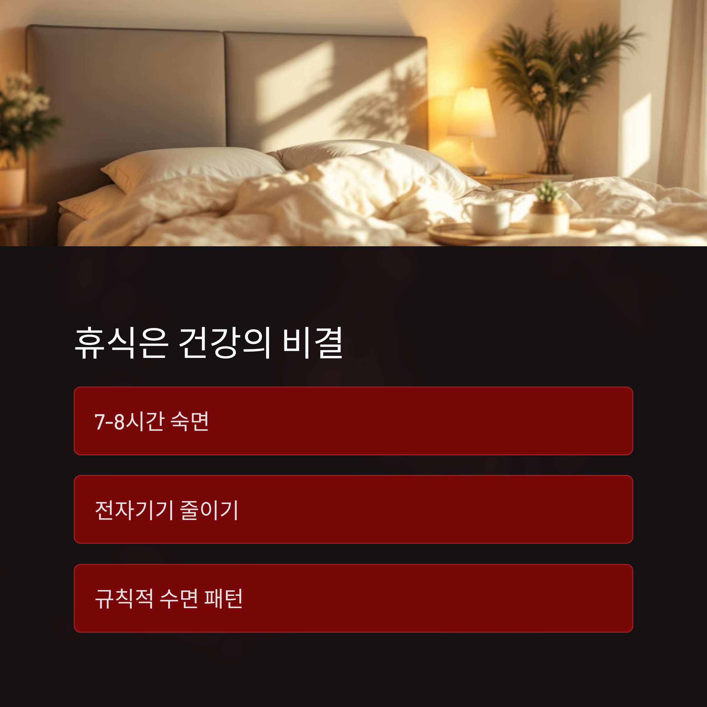 | 편안한 수면 환경 | 숙면 유도 | 어두운 방, 조용한 환경 유지 |