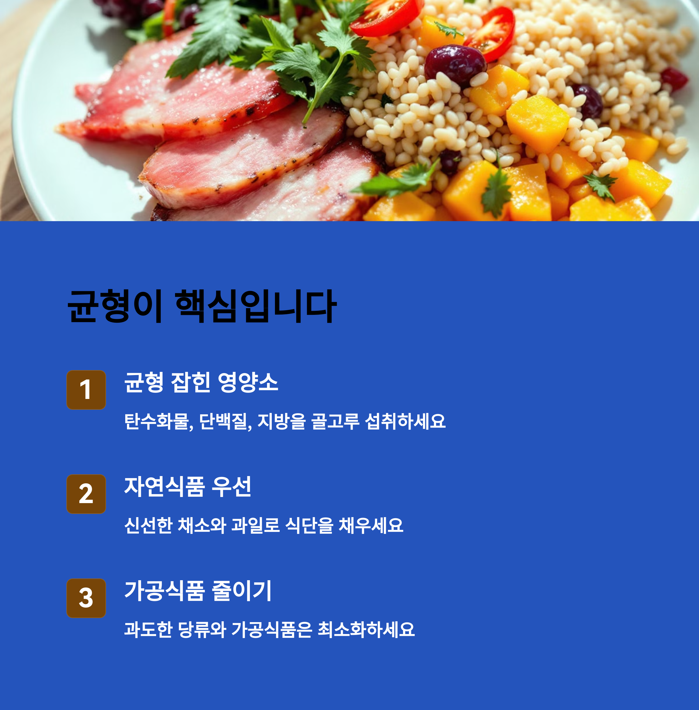 | 균형 잡힌 식단 | 탄수화물, 단백질, 지방 비율을 고려해야 합니다. |