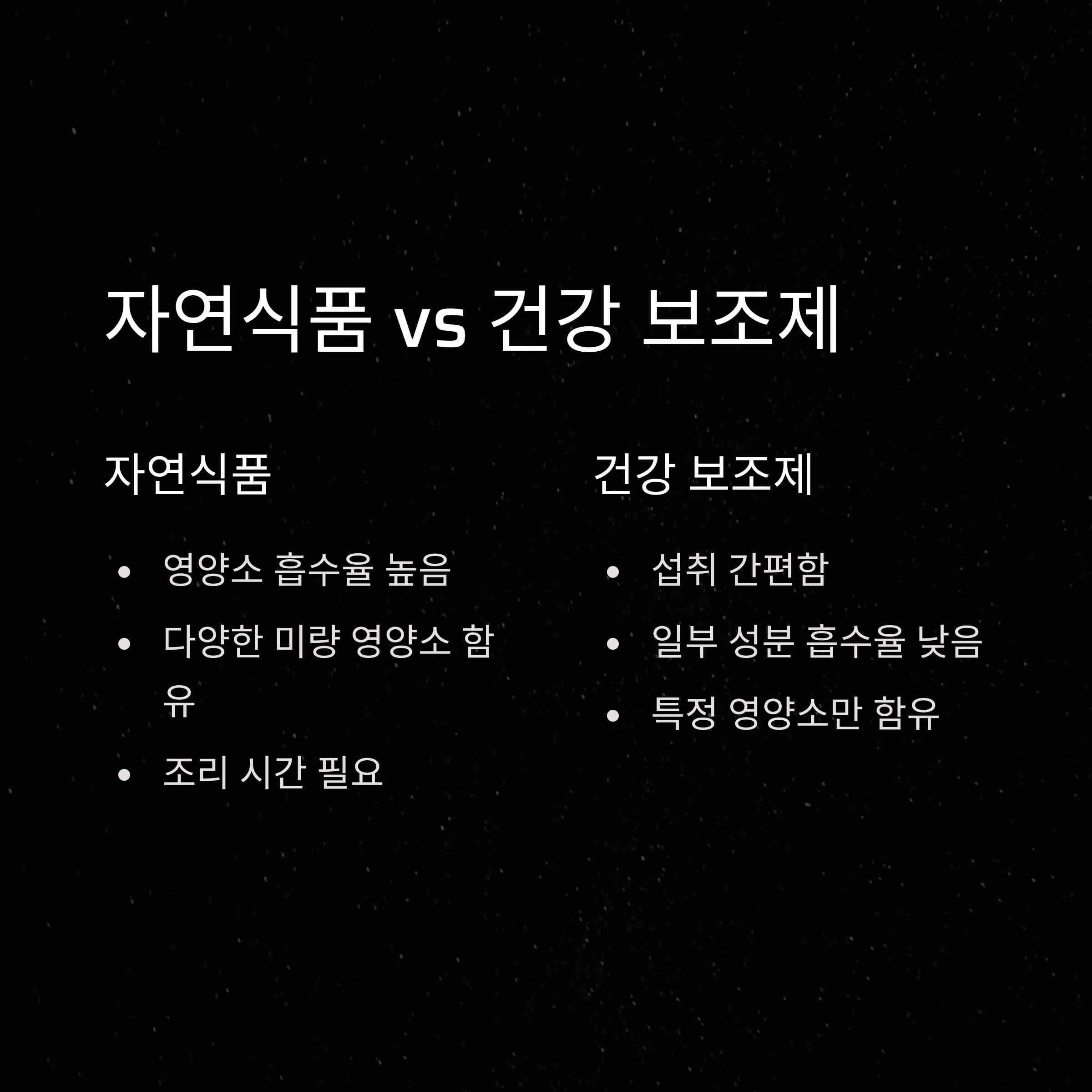 많은 전문가들은 건강 보조제보다 균형 잡힌 식단이 우선이라고 강조합니다. 하지만 현실적으로 모든 영양소를 음식만으로 충분히 섭취하는 것이 어려울 때도 있죠. 아래 표에서 건강 보조제와 자연식의 장단점을 비교해 봅시다.
