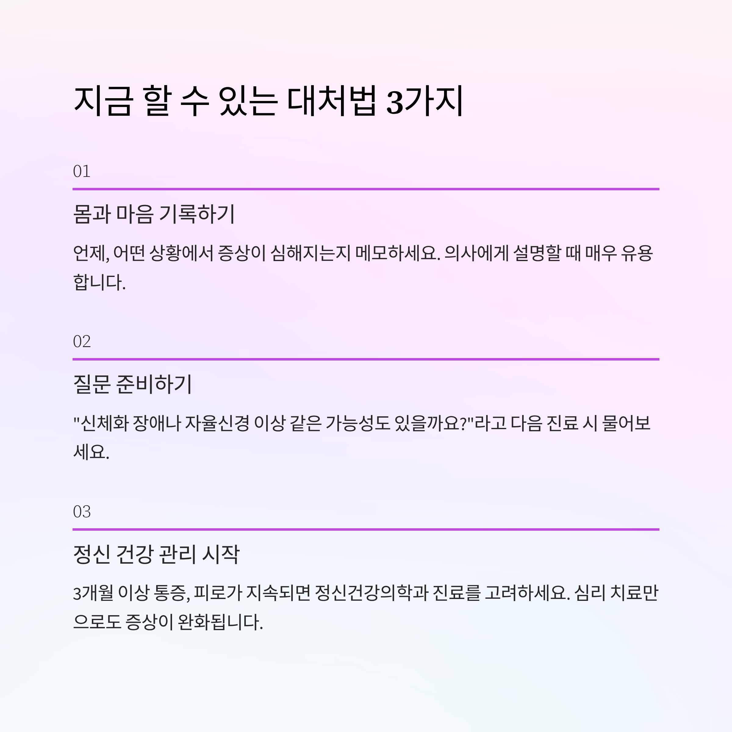 3개월 이상 통증, 피로가 지속되면 정신건강의학과 진료를 고려하세요.