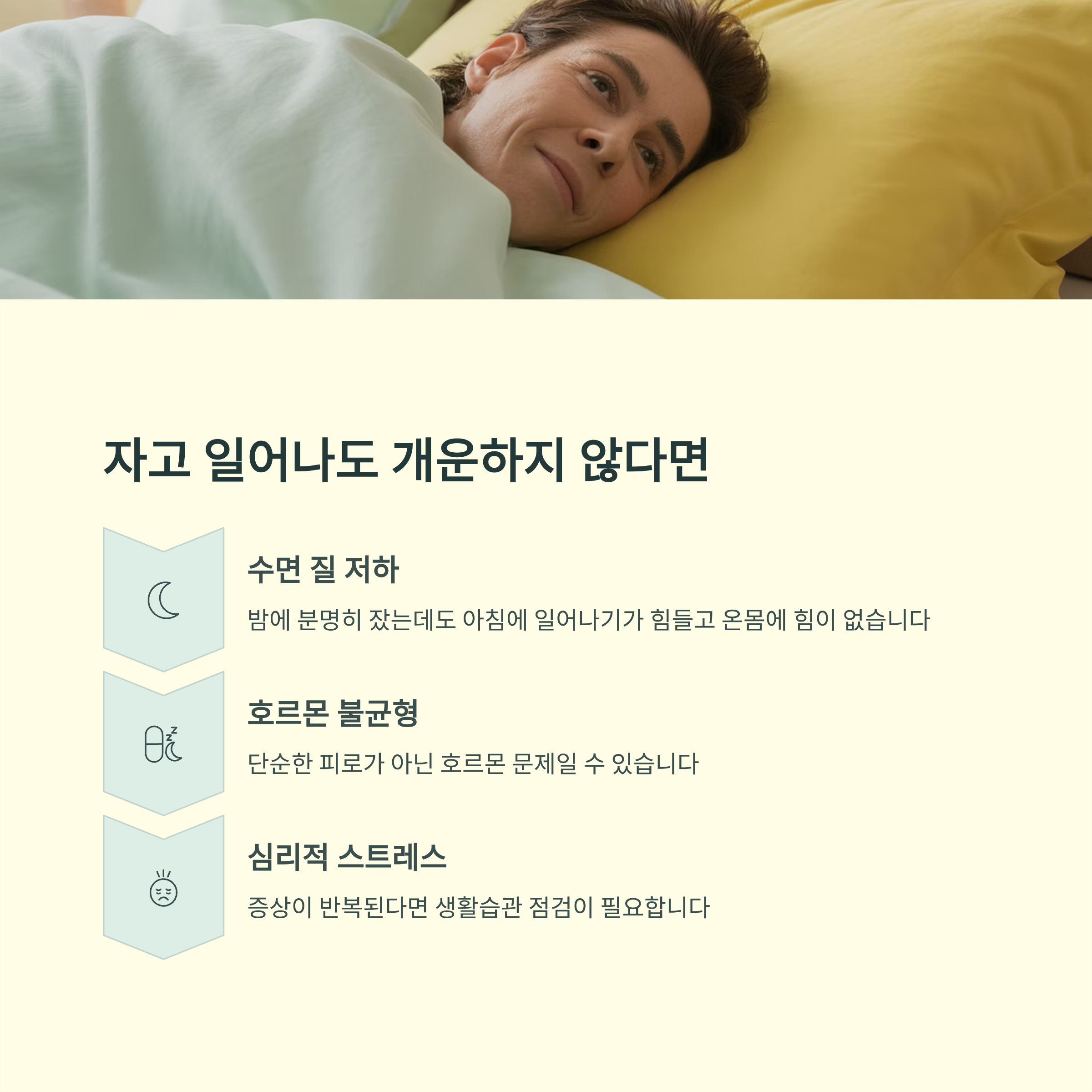 밤에 분명히 잤는데도 아침에 일어나기가 힘들고 온몸에 힘이 없다면, 이는 만성 피로의 신호일 수 있습니다. 단순한 피로가 아닌 호르몬 불균형, 수면 질 저하, 심리적 스트레스 등이 원인일 수 있으니 증상이 반복된다면 생활습관 점검이 필요합니다.