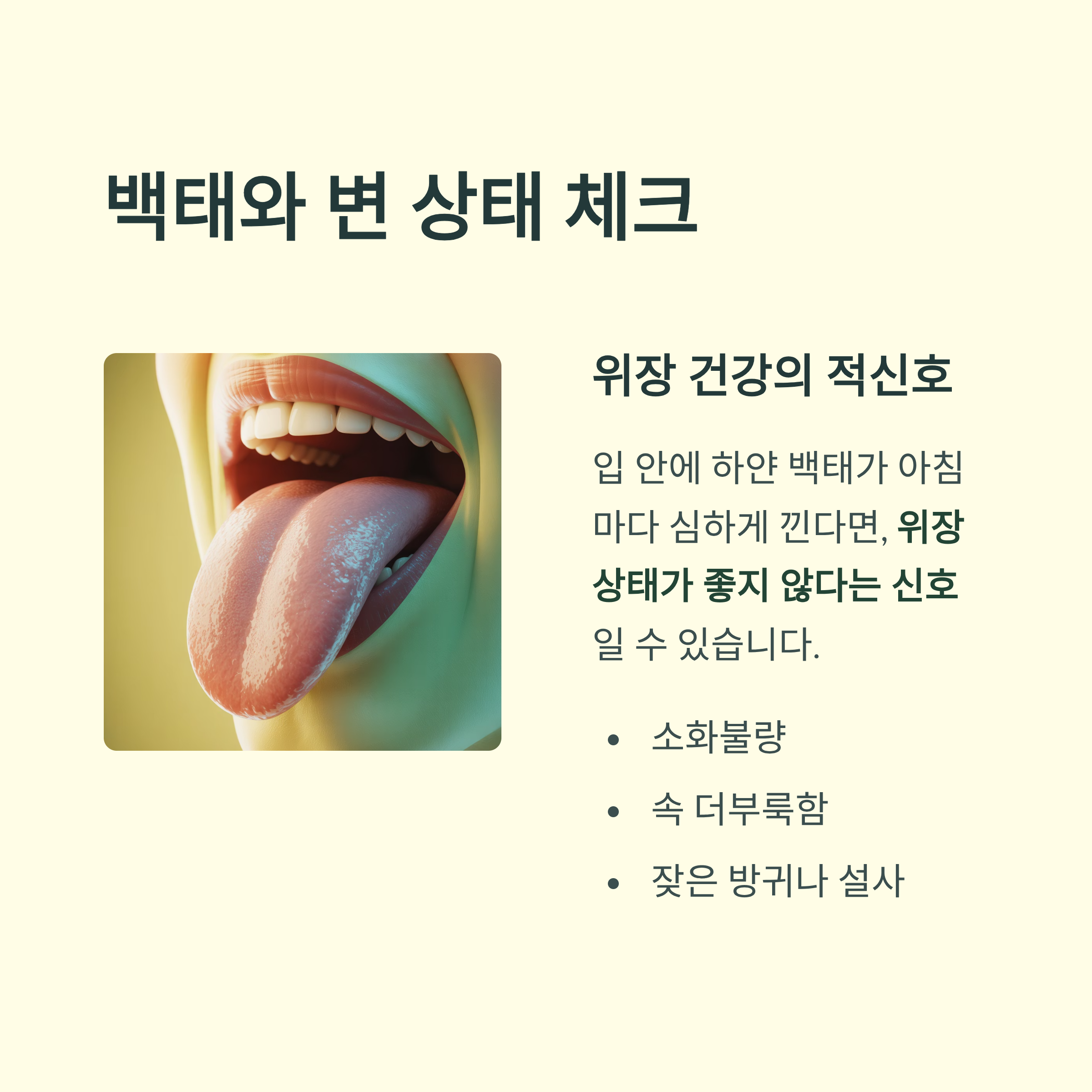 입 안에 하얀 백태가 아침마다 심하게 낀다면, 위장 상태가 좋지 않다는 신호일 수 있습니다. 특히 소화불량, 속 더부룩함, 잦은 방귀나 설사 등 장 관련 증상이 동반된다면 위장과 장 건강에 적신호가 들어온 것입니다.