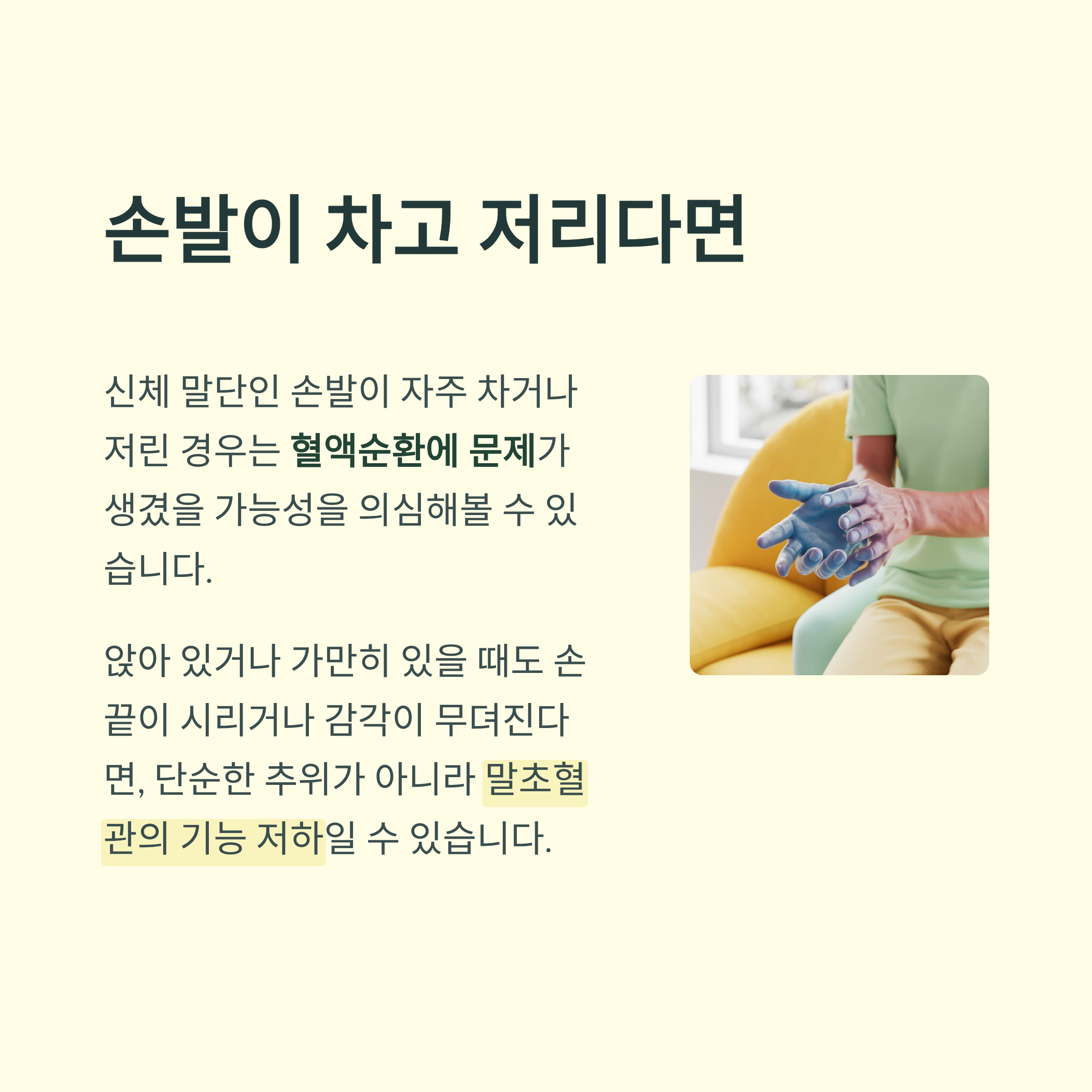 신체 말단인 손발이 자주 차거나 저린 경우는 혈액순환에 문제가 생겼을 가능성을 의심해볼 수 있습니다. 특히 앉아 있거나 가만히 있을 때도 손끝이 시리거나 감각이 무뎌진다면, 단순한 추위 때문이 아니라 말초혈관의 기능 저하일 수 있습니다.