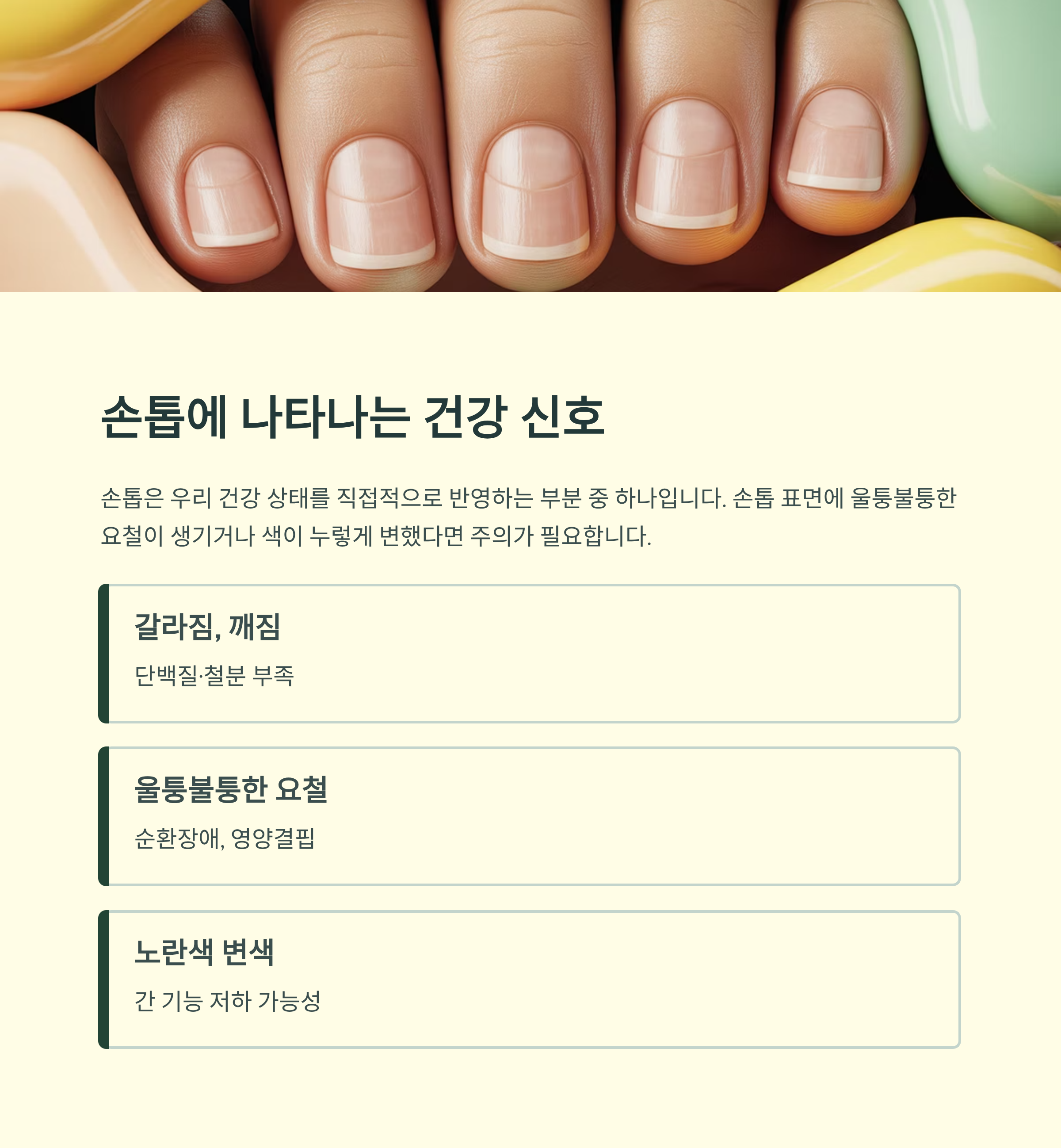 손톱은 우리 건강 상태를 직접적으로 반영하는 부분 중 하나입니다. 예를 들어 손톱 표면에 울퉁불퉁한 요철이 생기거나 색이 누렇게 변했다면, 영양 결핍이나 순환 장애, 혹은 간 기능 저하와 관련이 있을 수 있습니다. 또 쉽게 깨지거나 부서진다면 단백질이나 미네랄이 부족할 가능성도 배제할 수 없습니다.