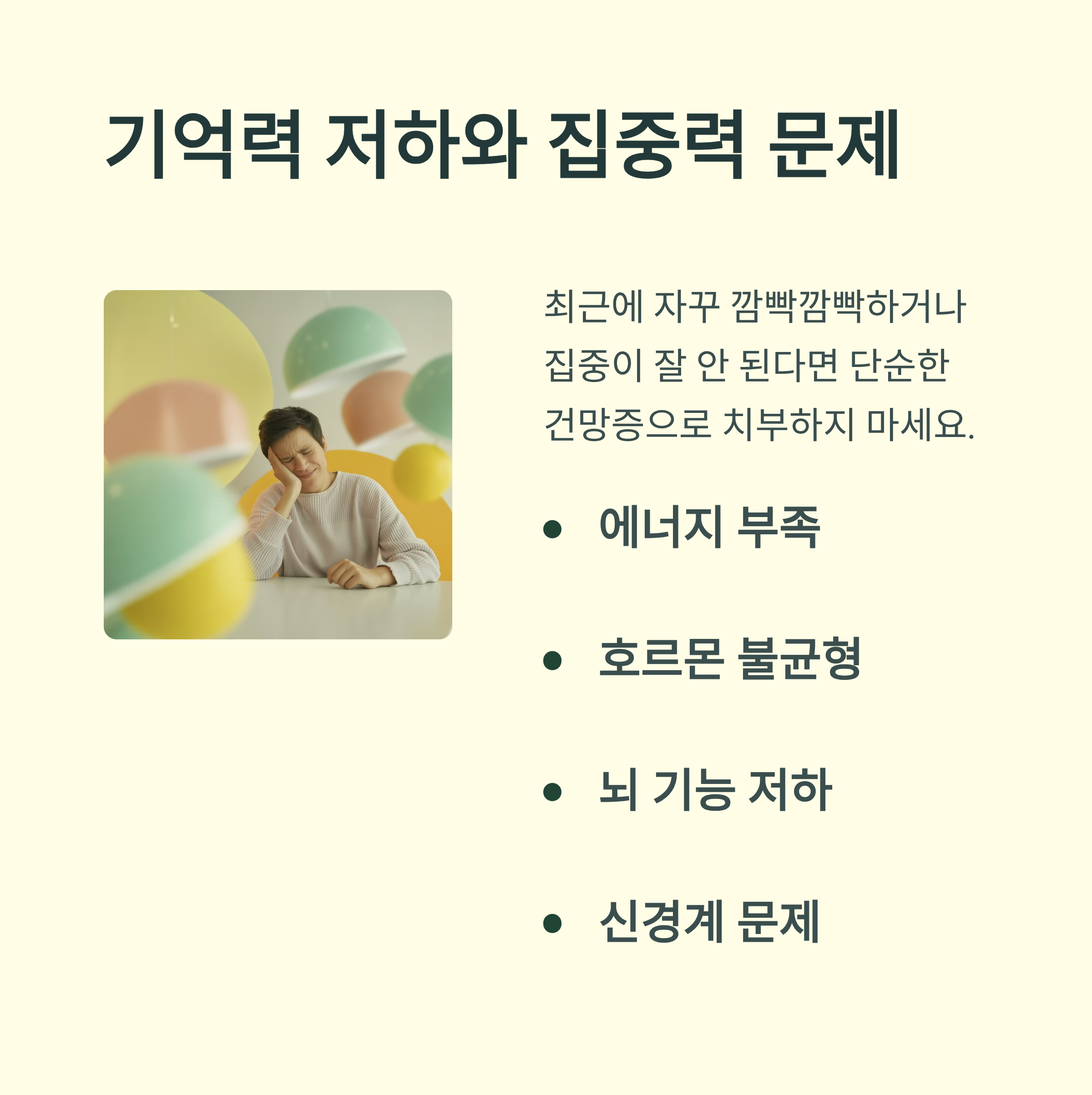 최근에 자꾸 깜빡깜빡하거나 집중이 잘 안 된다면 단순한 건망증으로 치부하지 마세요. 에너지 부족이나 호르몬 불균형, 심지어 뇌 기능 저하의 초기 신호일 수도 있습니다. 특히 이유 없이 무기력하거나 감정 기복이 심하다면, 신경계에 문제가 생겼을 가능성도 배제할 수 없습니다.