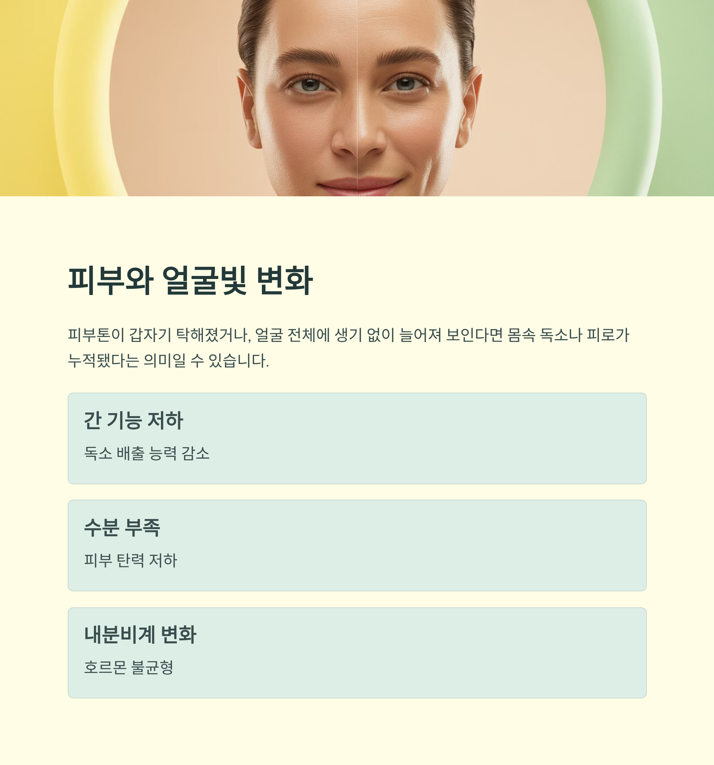 피부톤이 갑자기 탁해졌거나, 얼굴 전체에 생기 없이 늘어져 보인다면 몸속 독소나 피로가 누적됐다는 의미일 수 있습니다. 간 기능 저하나 수분 부족, 내분비계 변화도 이러한 현상을 유발할 수 있으므로 무시하지 않는 게 좋습니다.