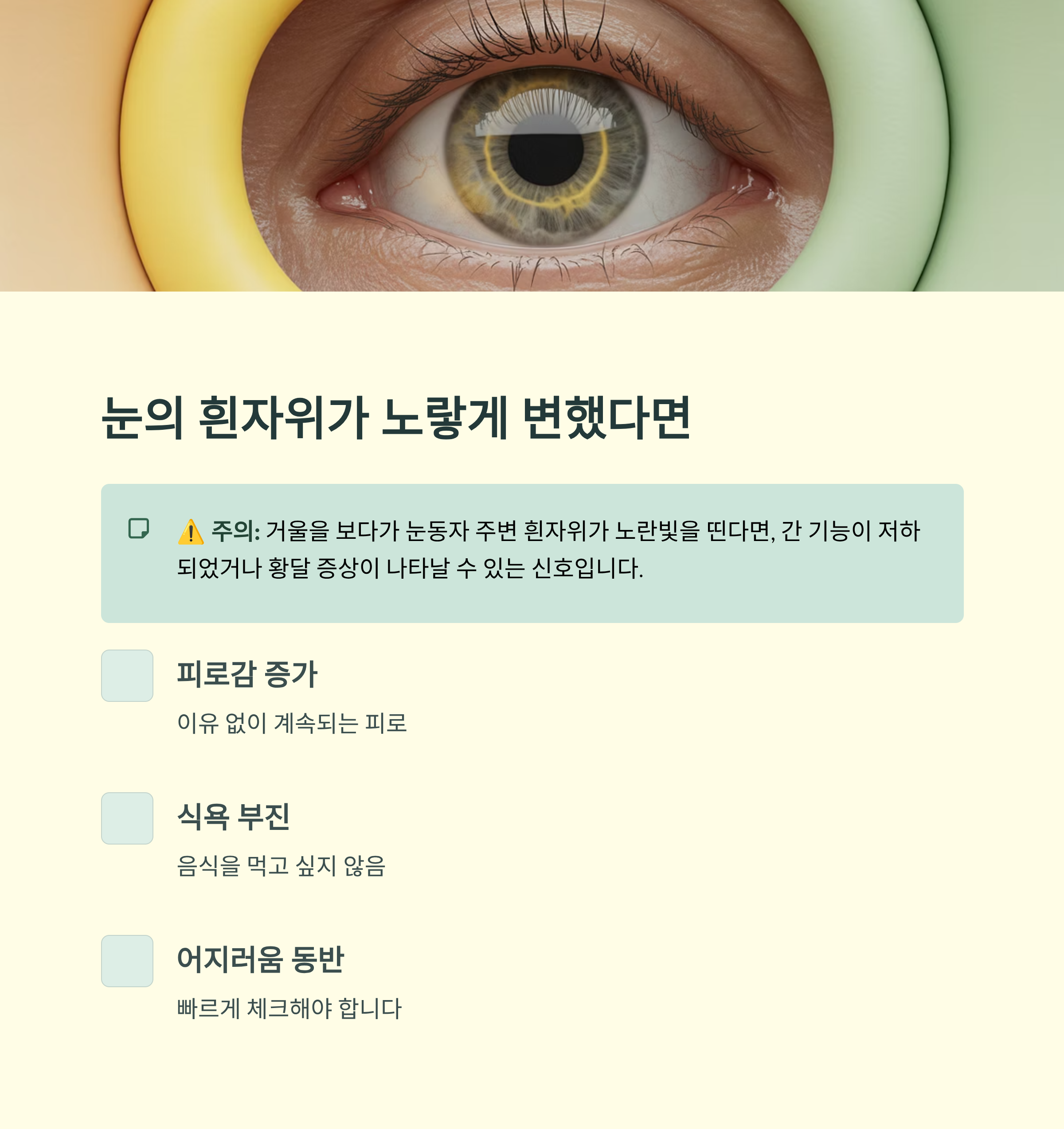 거울을 보다가 눈동자 주변 흰자위가 노란빛을 띤다면, 간 기능이 저하되었거나 황달 증상이 나타날 수 있는 신호입니다. 특히 피로, 식욕 부진, 어지러움이 동반된다면 빠르게 체크해야 합니다.