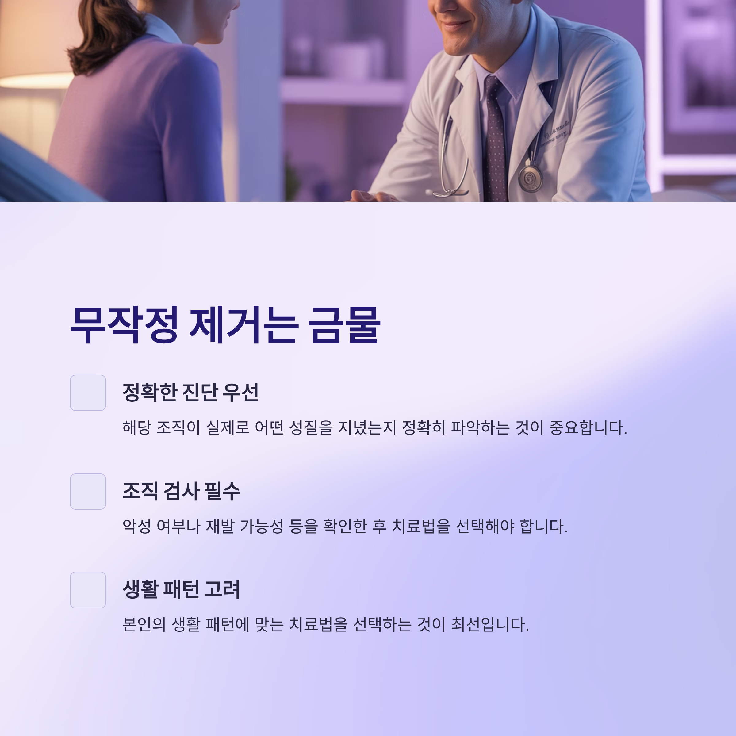 조직 검사를 통해 악성 여부나 재발 가능성 등을 확인한 후, 본인의 생활 패턴에 맞는 치료법을 선택하는 것이 최선입니다.