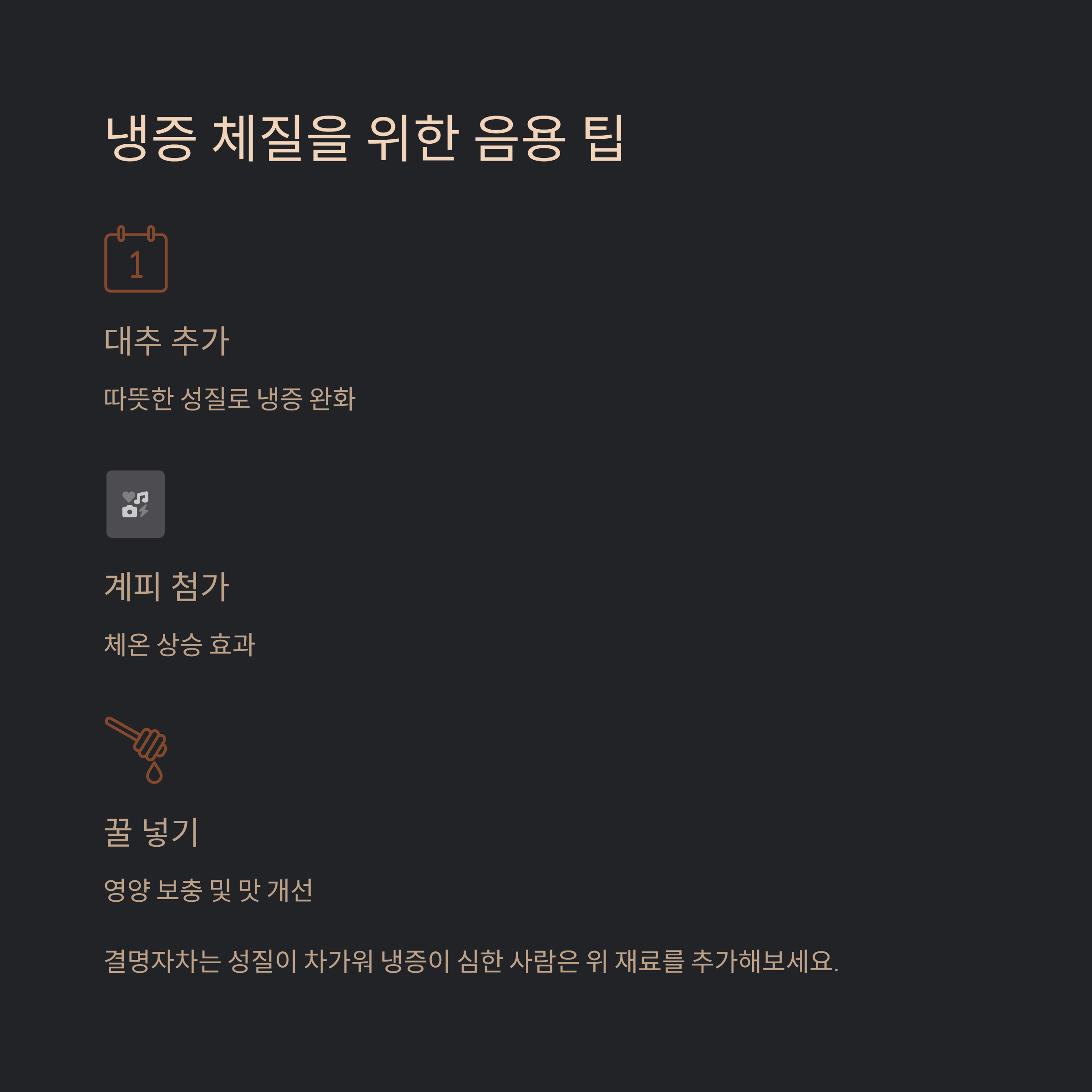 이 경우 대추, 계피, 꿀 등을 함께 넣어 따뜻하게 달여 마시면 체질 부담을 줄일 수 있습니다.
