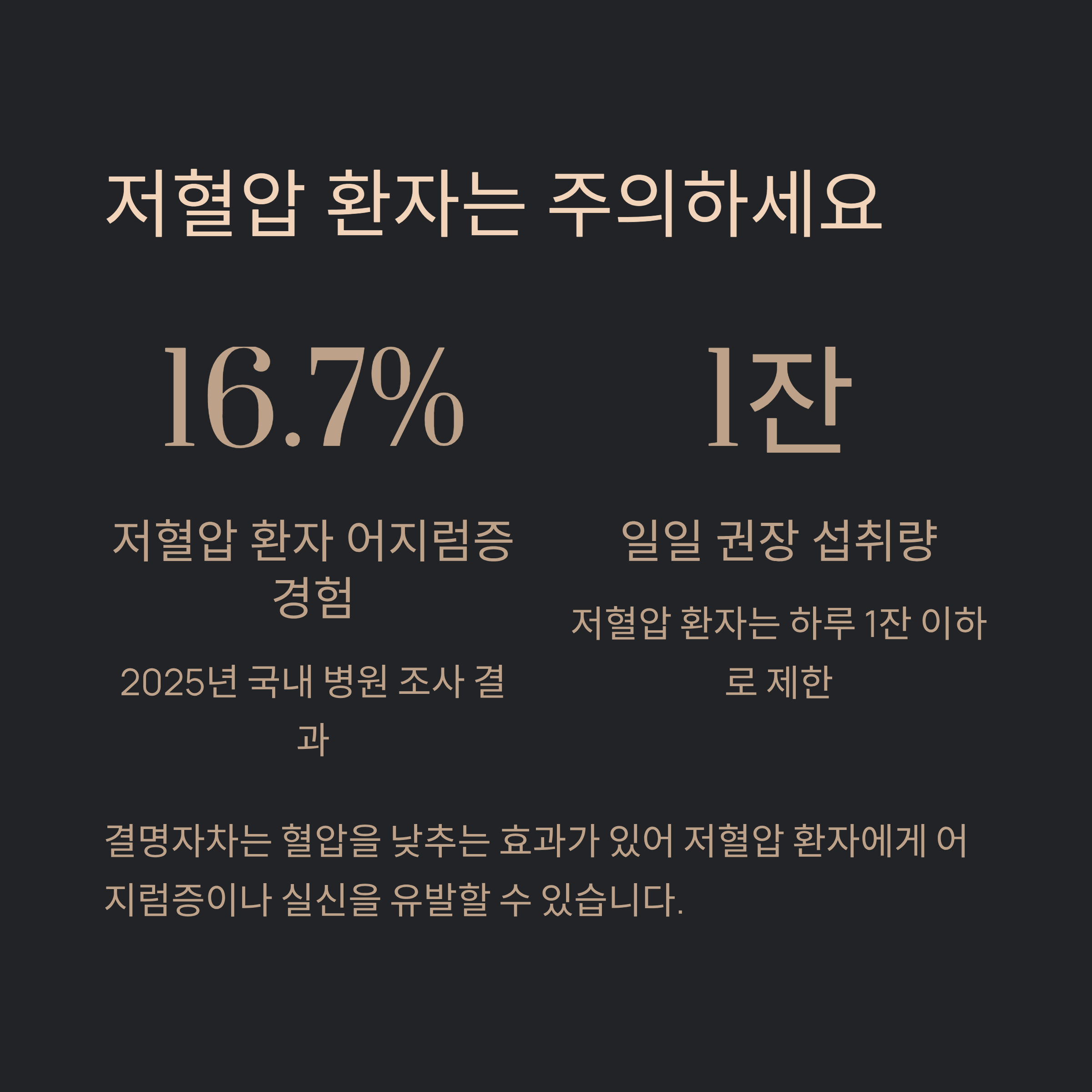 따라서 저혈압 환자는 하루 1잔 이하로 제한하는 것이 안전합니다.