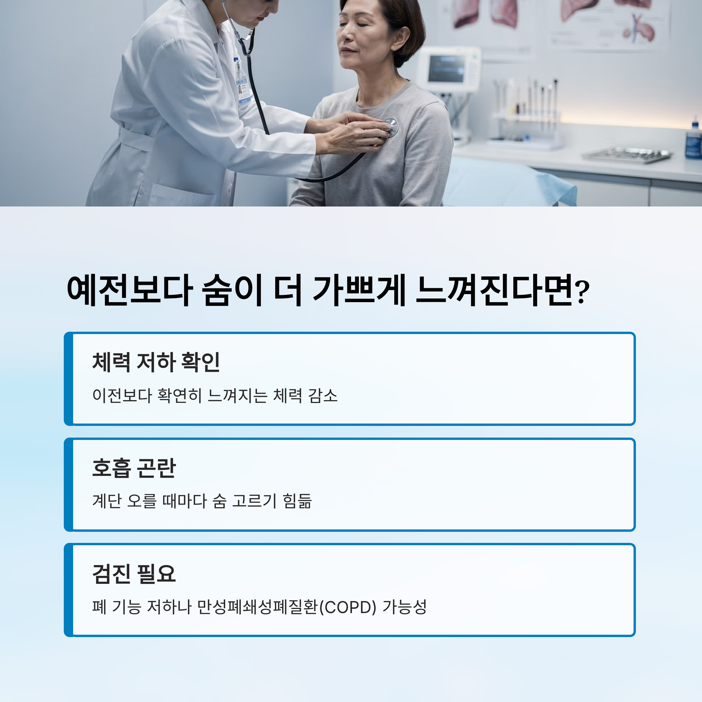특히 흡연 경력이 오래되었거나, 현재 흡연 중이라면 ‘숨 가쁨’ 증상을 예민하게 받아들이는 것이 중요합니다.