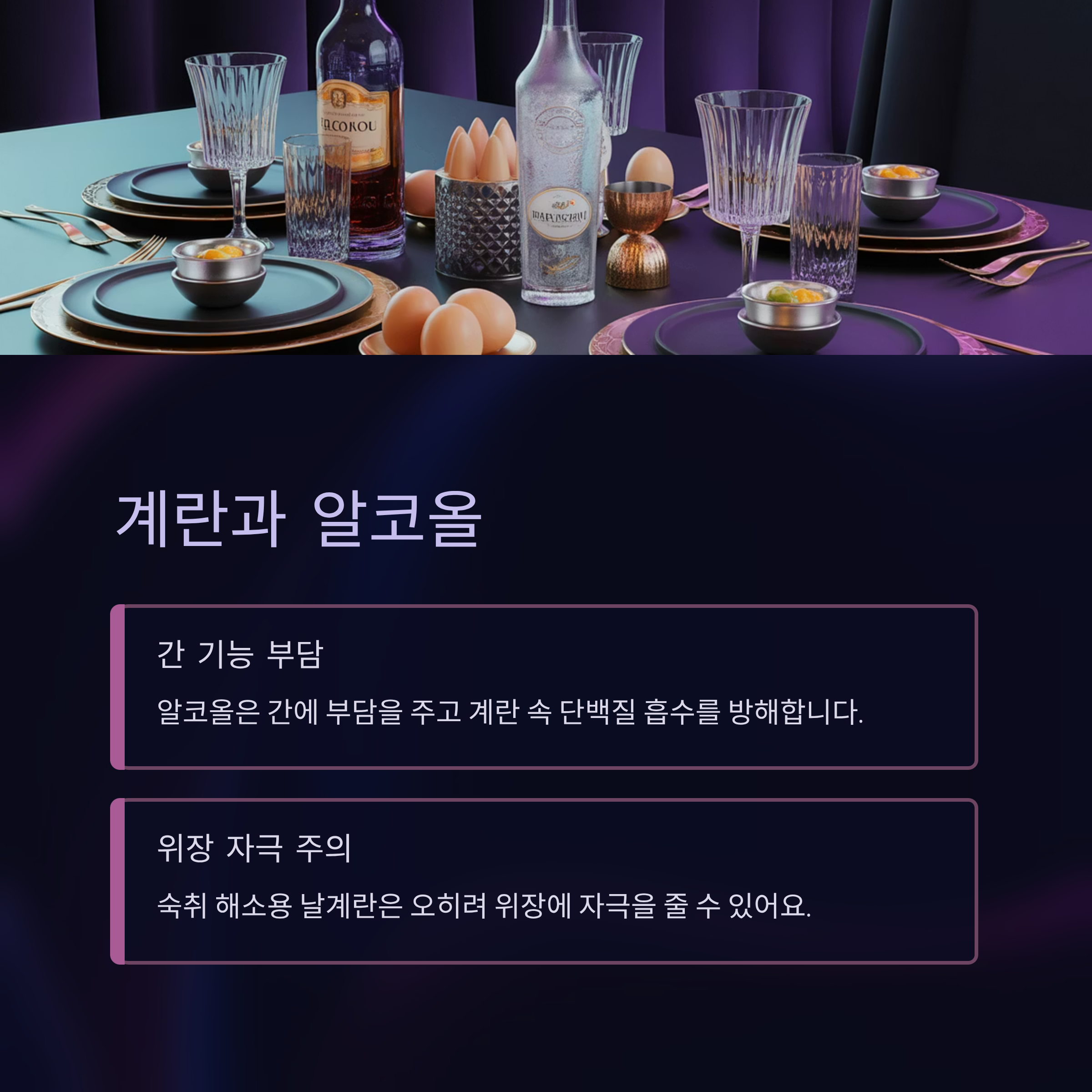 알코올은 간 기능에 부담을 주고, 계란 속 단백질 흡수를 방해할 수 있어요.