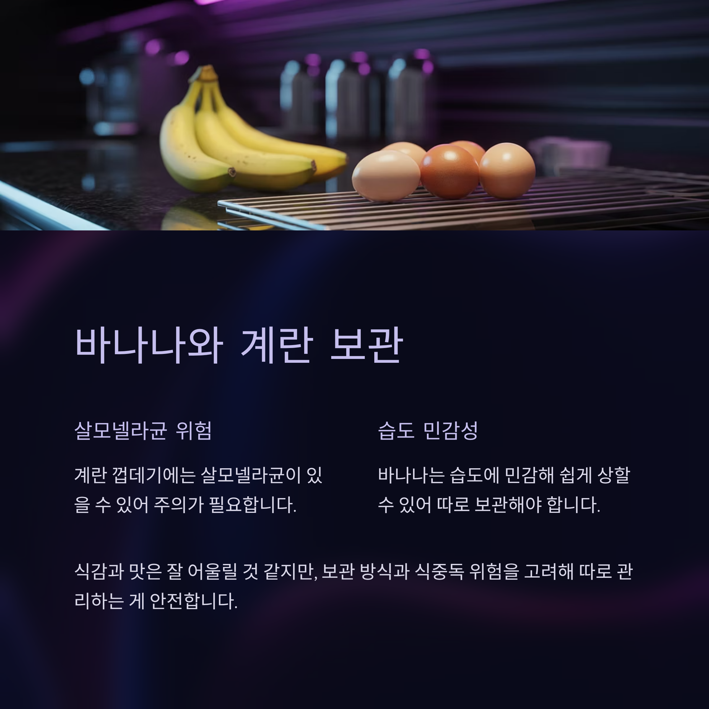 계란 껍데기에는 살모넬라균이 있을 수 있고, 바나나는 습도에 민감해 쉽게 상할 수 있기 때문이에요.