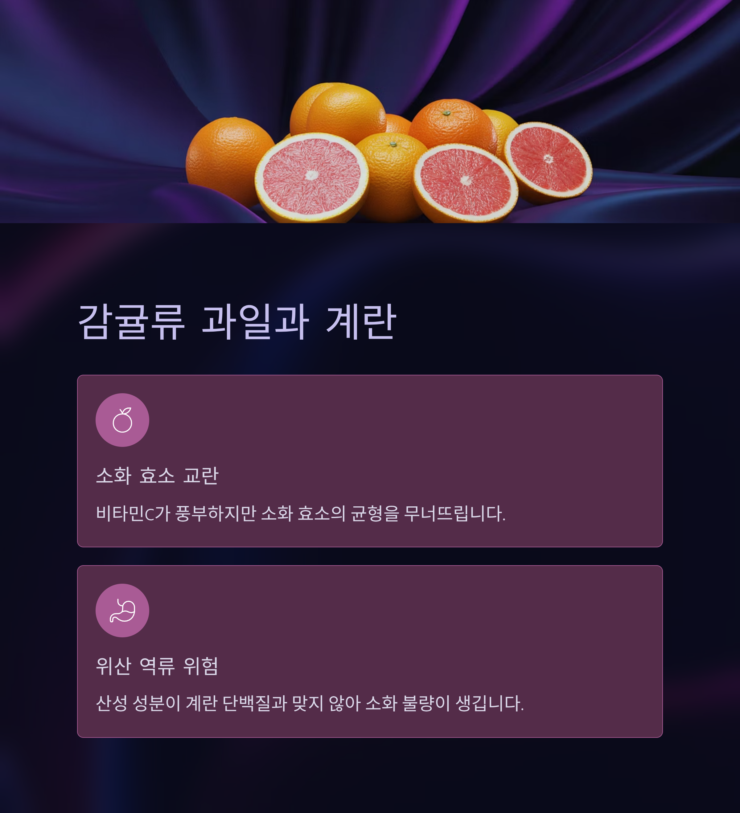 | 계란 + 감귤류 | 소화 효소 교란, 위장 자극 |