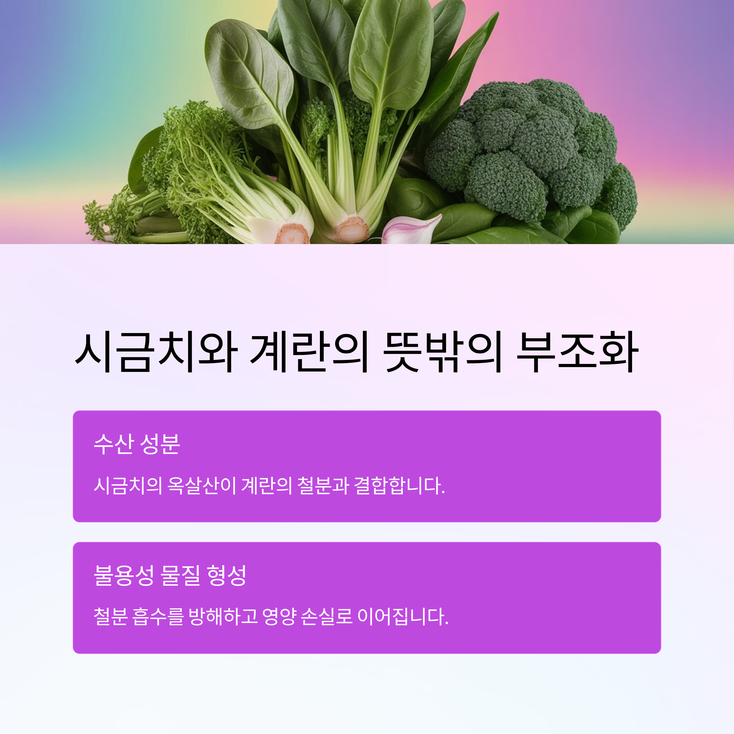 시금치에는 수산 성분(옥살산)이 함유돼 있는데요, 이 성분이 계란에 포함된 철분과 결합해 불용성 물질을 형성하게 됩니다. 결과적으로 철분 흡수를 방해하고 영양 손실로 이어질 수 있어요.
