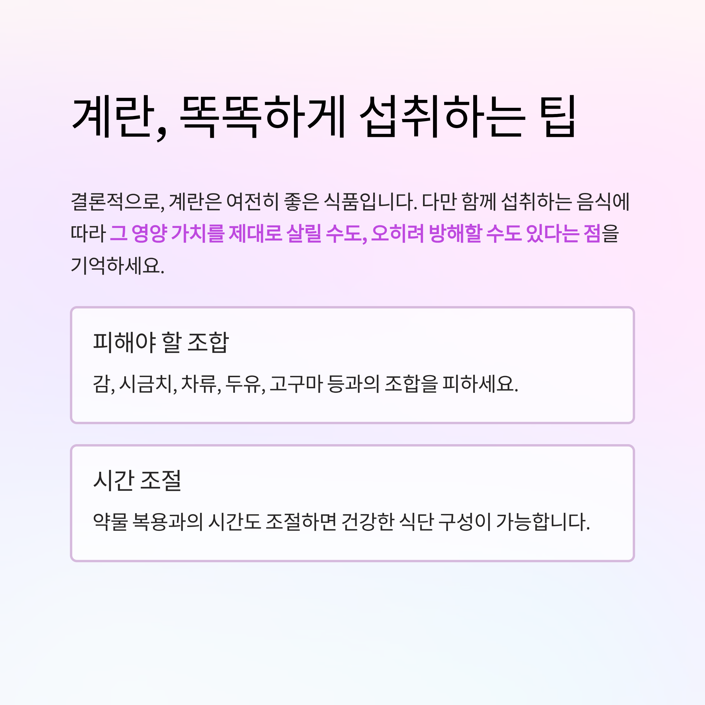 결론적으로, 계란은 여전히 좋은 식품입니다. 다만 함께 섭취하는 음식에 따라 그 영양 가치를 제대로 살릴 수도, 오히려 방해할 수도 있다는 점을 기억하세요.