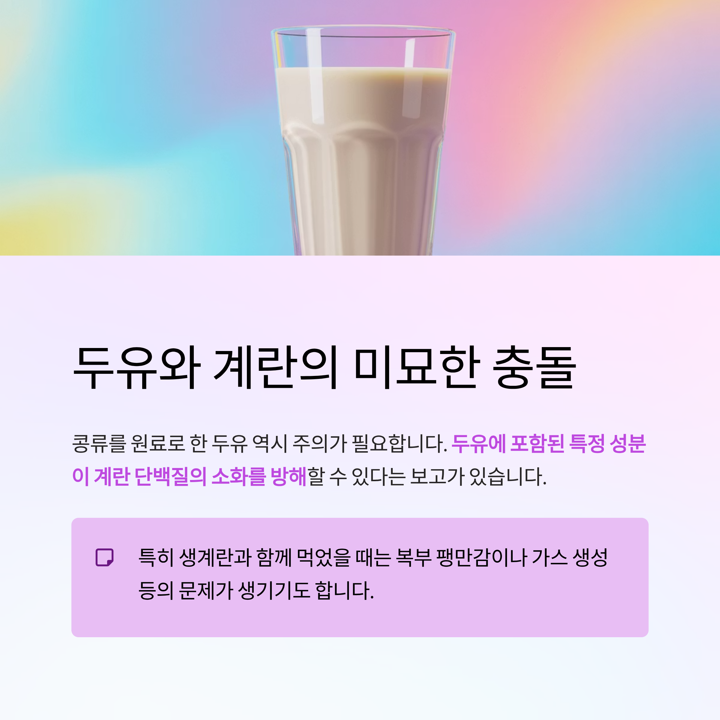 콩류를 원료로 한 두유 역시 주의가 필요합니다. 두유에 포함된 특정 성분이 계란 단백질의 소화를 방해할 수 있다는 보고가 있습니다. 특히 생계란과 함께 먹었을 때는 복부 팽만감이나 가스 생성 등의 문제가 생기기도 합니다.